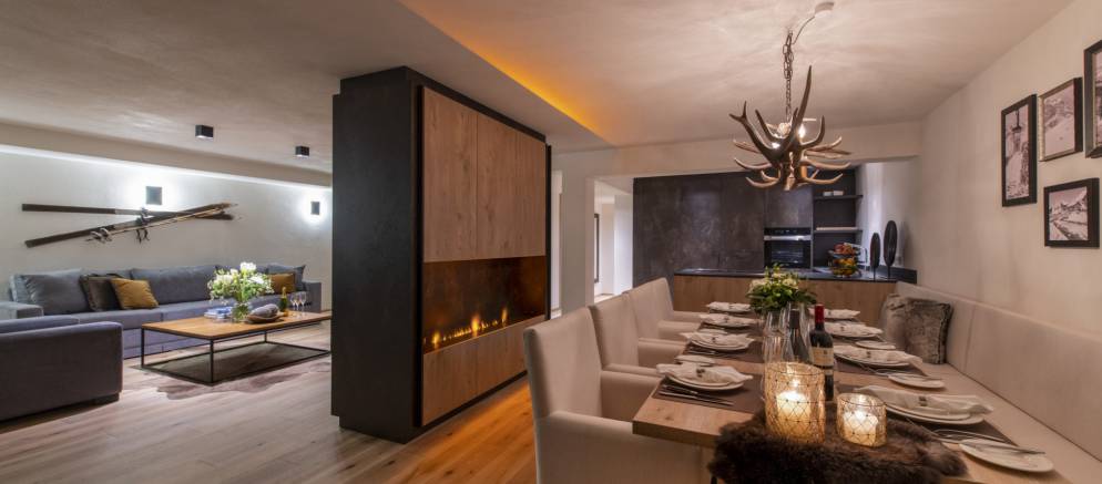 The Brunnenhof 3 apartment is located on the first floor and is arranged over a spacious 145m2 of living space. The open plan kitchen, dining and living area is a fantastic space in which to relax and entertain. A large TV is mounted on a wide column which provides a degree of separation from the dining area, where an elegant table seats up to eight and faces a gas burning fireplace. The well-equipped kitchen overlooks the living space and lends to the convivial ambiance when dining in.