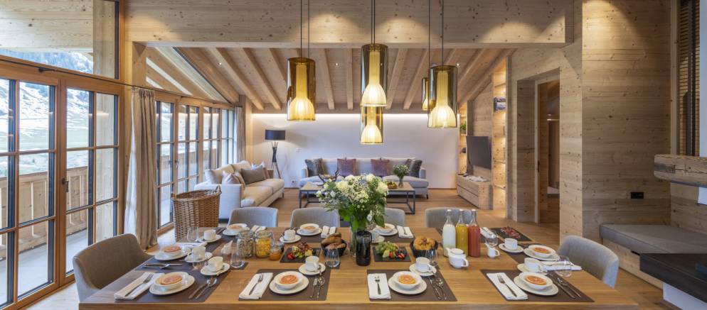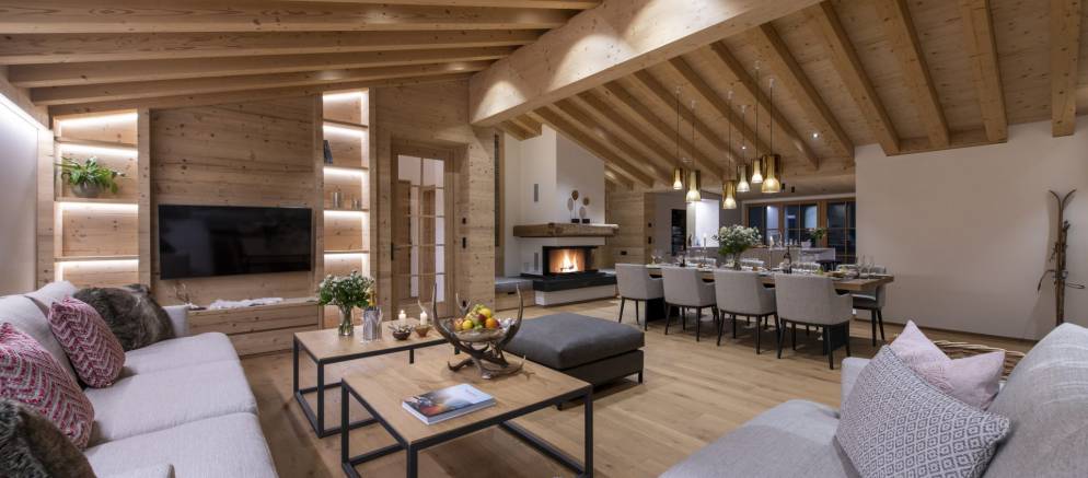 The living area has two large comfortable sofas and floor to ceiling windows through which you can access the balcony where you can enjoy views over the mountains and surrounding valley. The dining table seats ten guests comfortably and the modern kitchen is well-equipped and has a small breakfast bar. There is also a separate TV room located behind the open plan living area, where you can enjoy a movie.