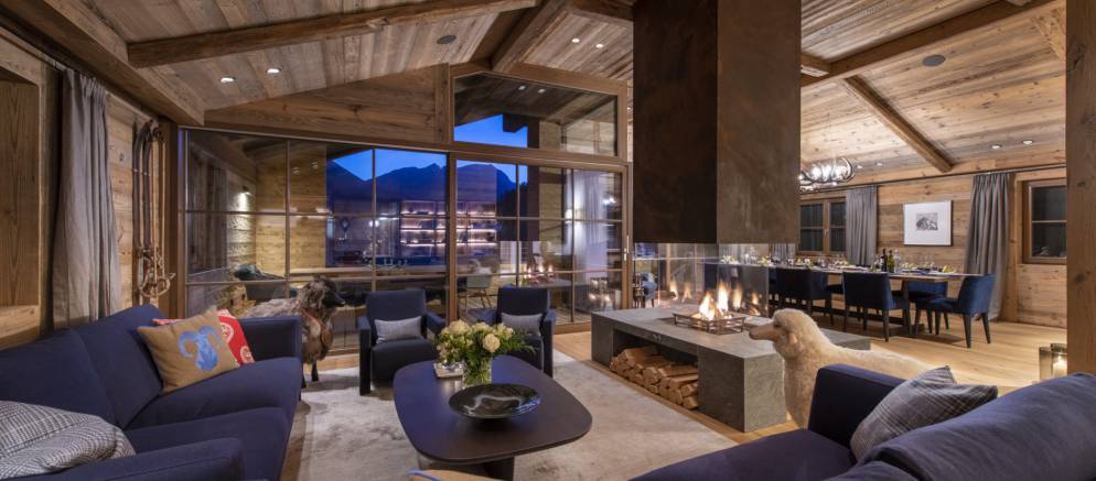 The dining table can seat 12 guests and is perfect for elegant dinners and is overlooked by the large kitchen. The sitting room has been elegantly decorated and there is also a snug TV room, that can be closed off from the main living space, perfect for children to enjoy whilst their parents enjoy dinner with friends. On the lower ground floor of the chalet there is ski and boot storage as well as a private laundry room.