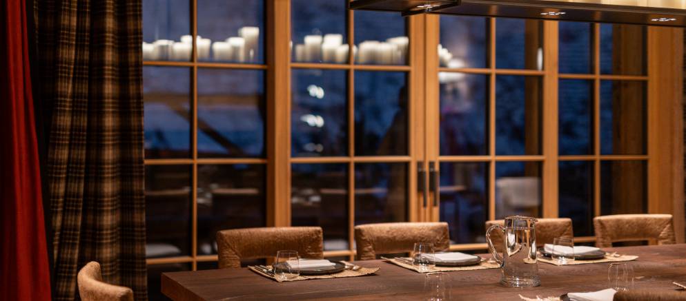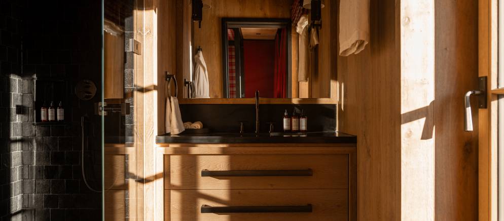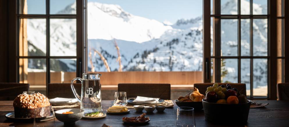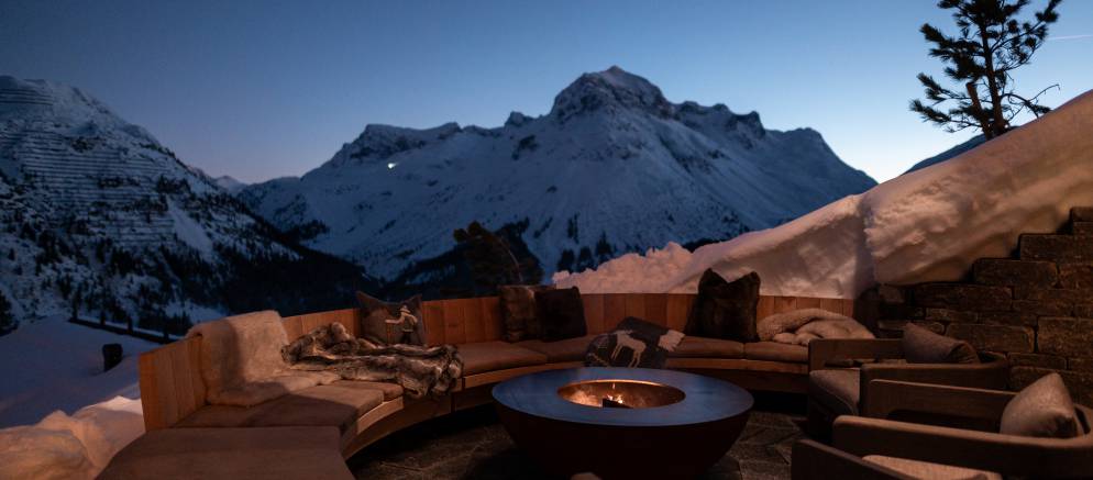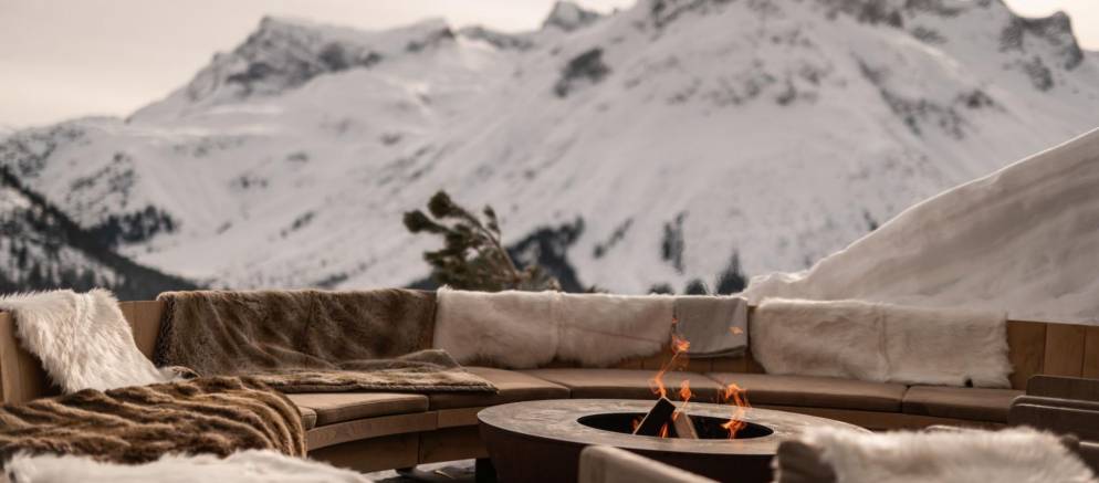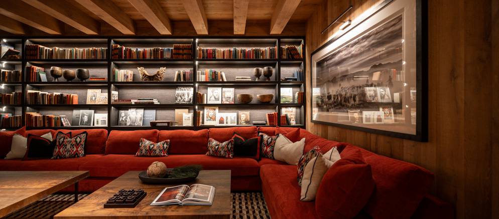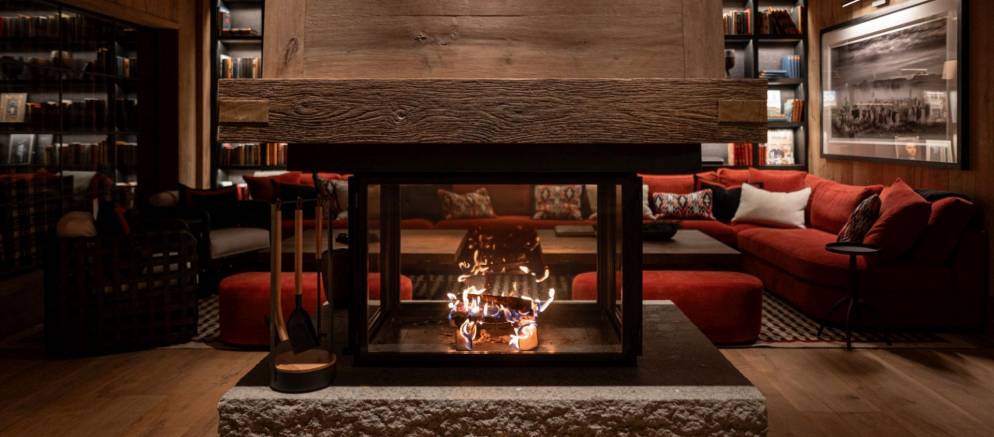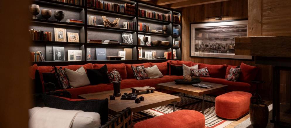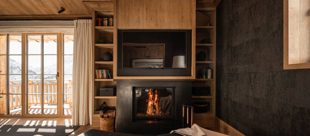 The main living spaces are spread across the floor below the bedrooms and spill out onto a wide terrace where meals can be enjoyed in the warmer spring months. A circular seating area with mountain backdrop and firepit is a great spot for your favourite après ski tipple. Inside, the cosy ambiance is enhanced with a central fireplace, deep sofas and rich fabrics, and a dedicated bar room for late night conversations.
