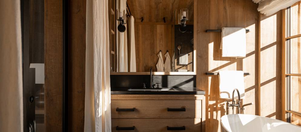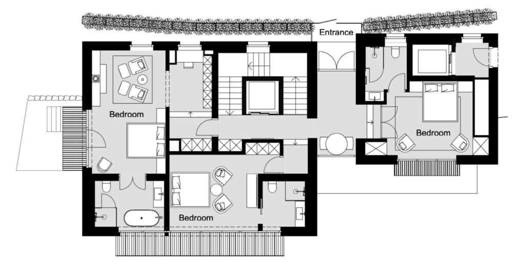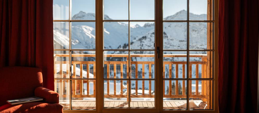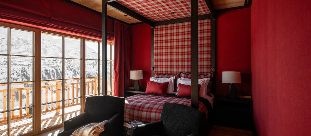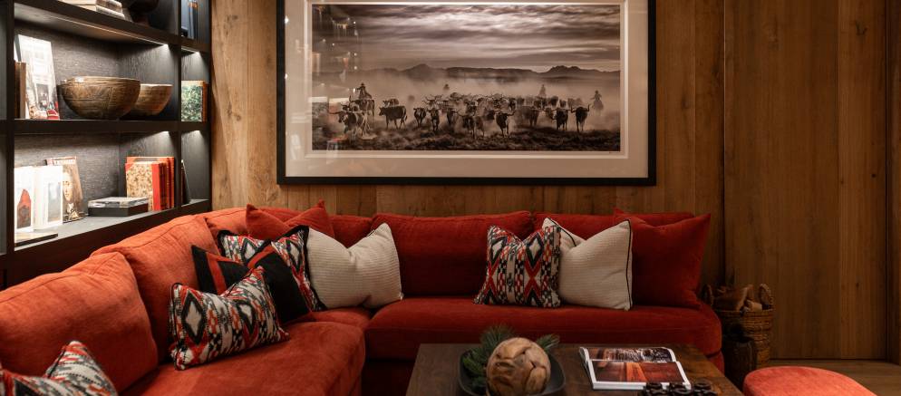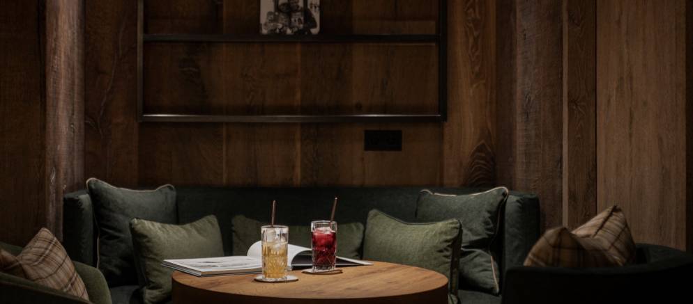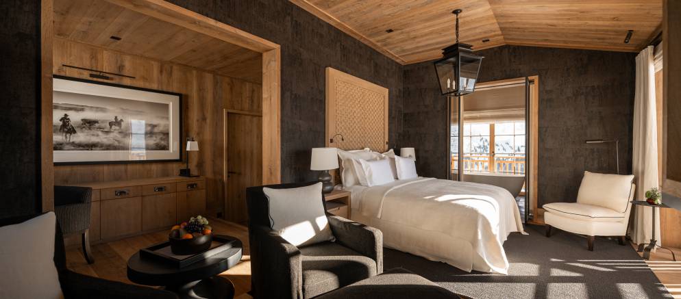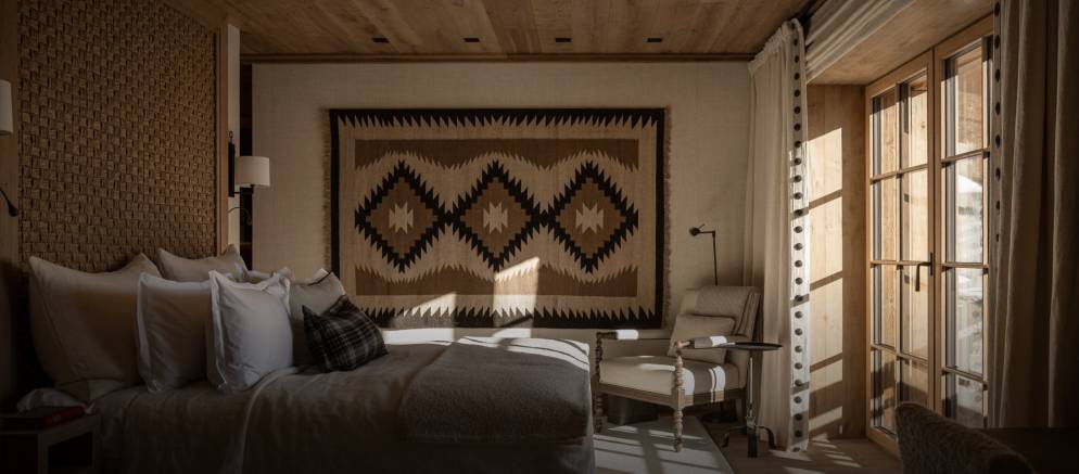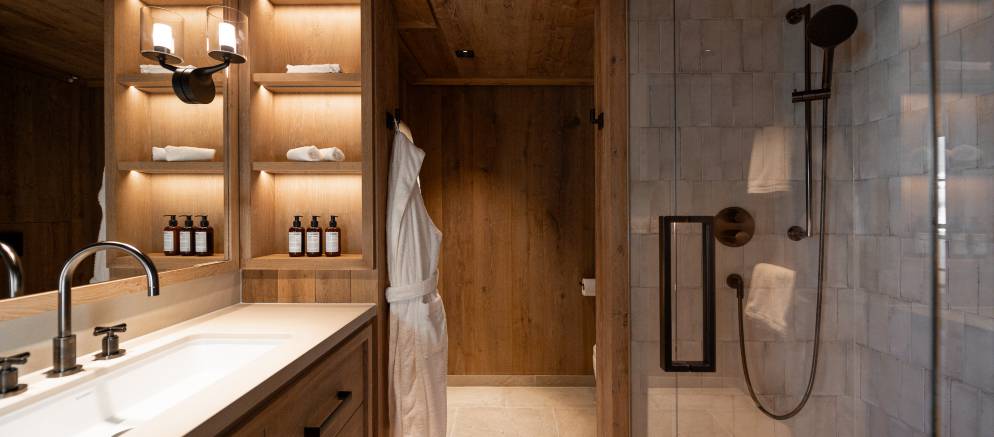 The main living spaces are spread across the floor below the bedrooms and spill out onto a wide terrace where meals can be enjoyed in the warmer spring months. A circular seating area with mountain backdrop and firepit is a great spot for your favourite après ski tipple. Inside, the cosy ambiance is enhanced with a central fireplace, deep sofas and rich fabrics, and a dedicated bar room for late night conversations.