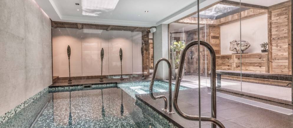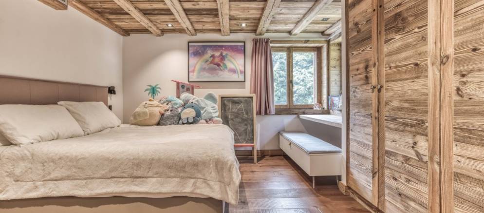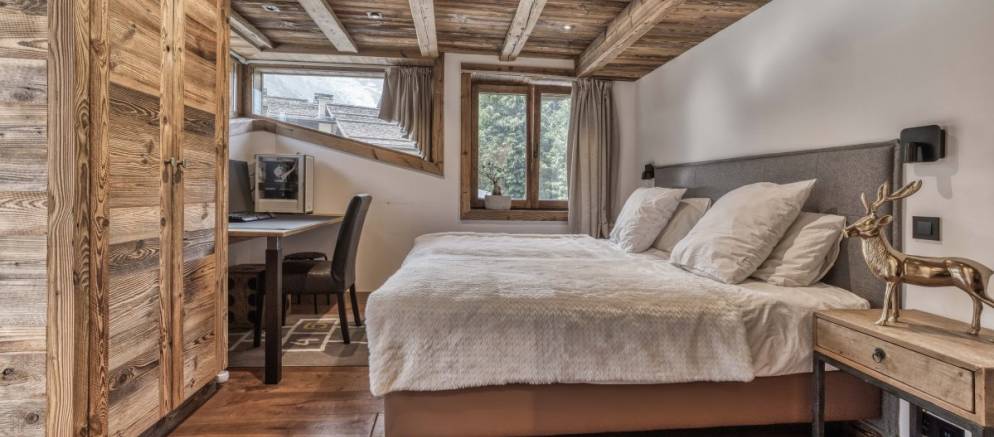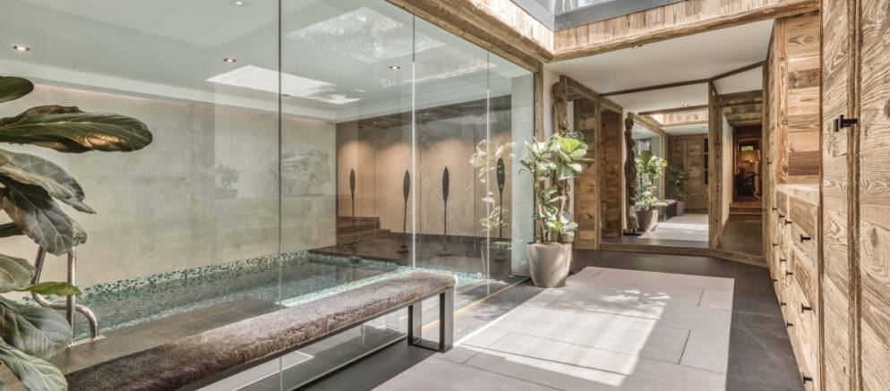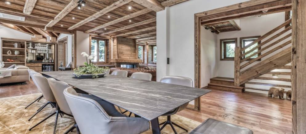 The chalet is arranged over four floors and can accommodate 13 people in 7 bedrooms. The ground floor of the chalet features a large living room with high vaulted ceilings and excellent views over the mountains. The library has a beautiful indoor/outdoor fireplace, whilst the 4-metre-long dining table is adjacent to the professionally equipped kitchen.