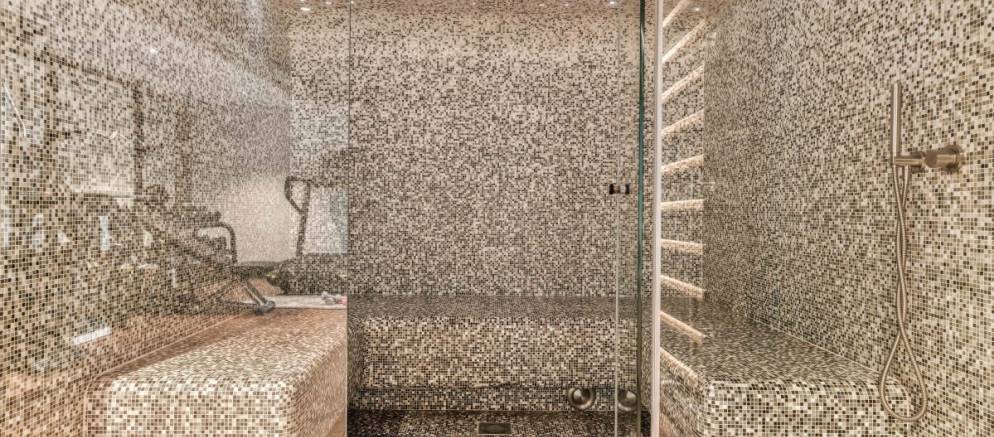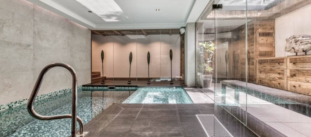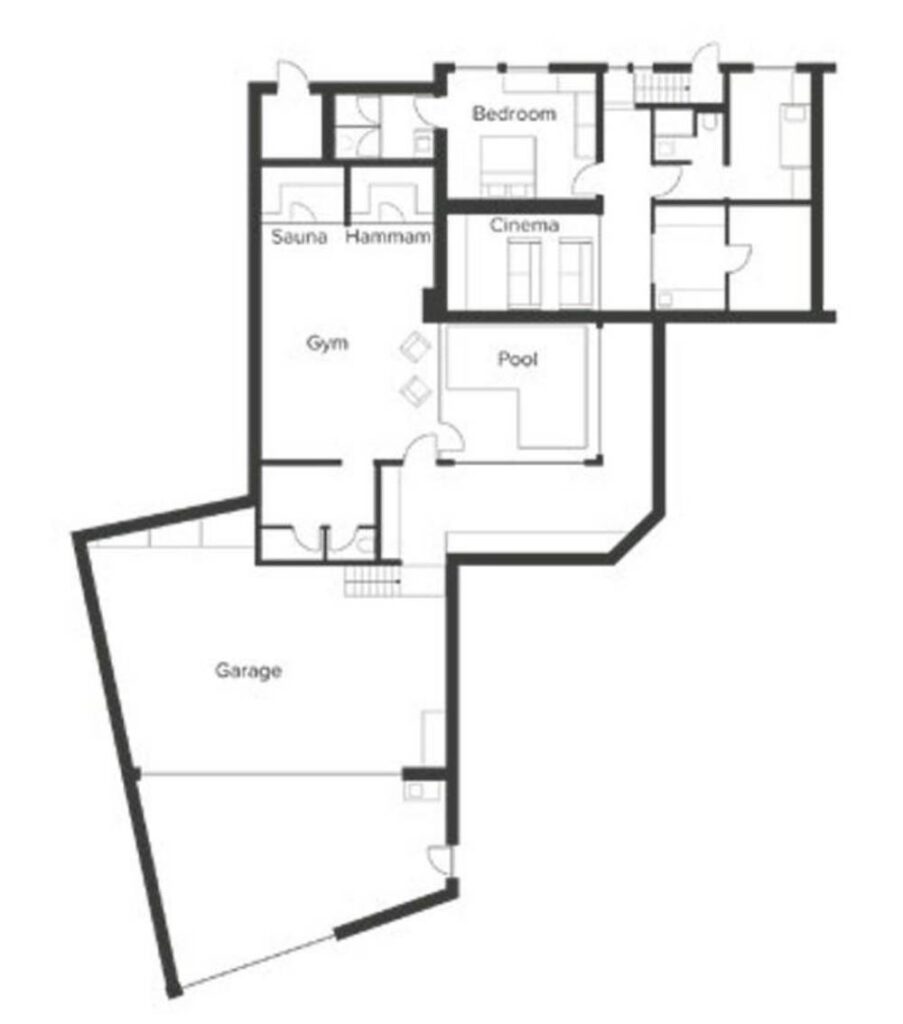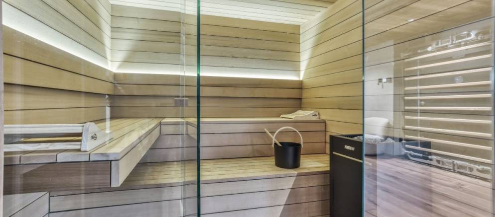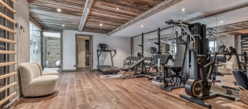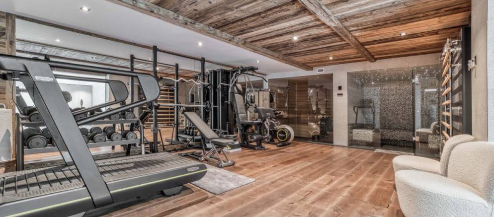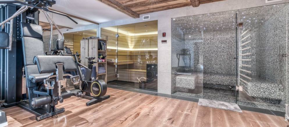On the lower ground floor is one of the main features of the chalet, the impressive wellness centre. The gym is very spacious and features all the machines you need for a full workout, and there is plenty of space for some morning yoga. The swimming pool with current system which enables so-called ‘endless swimming’, also has a Jacuzzi section. After your workout you can relax in the sauna and steam room, or head outside to the hot tub in the garden.