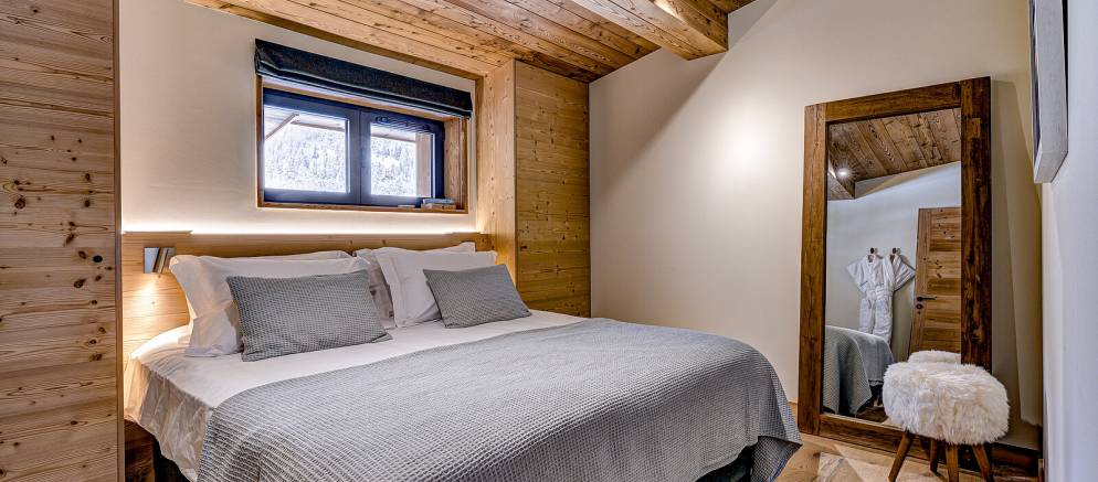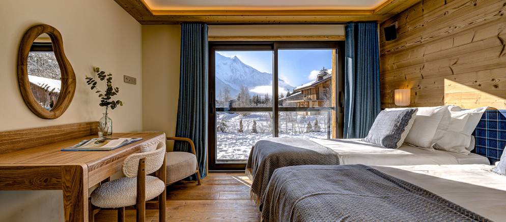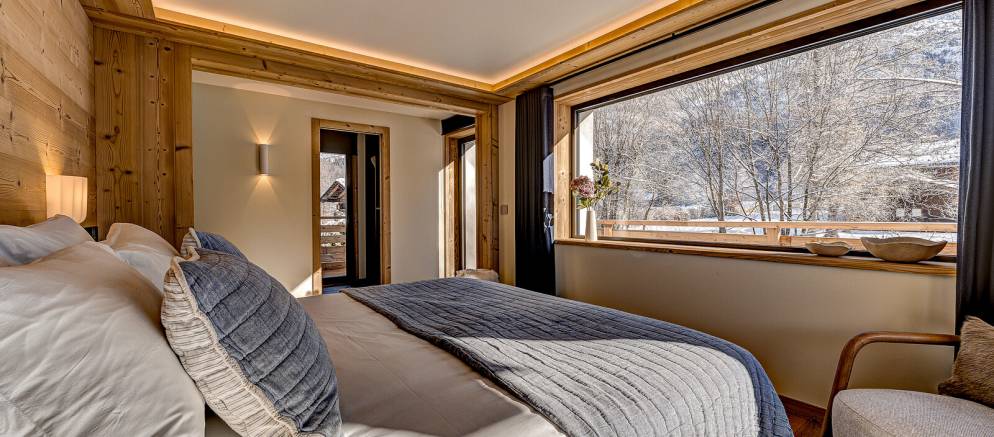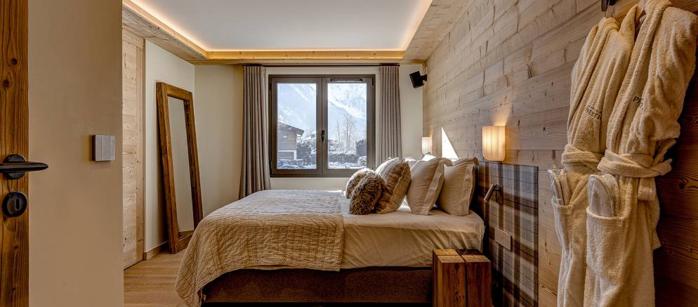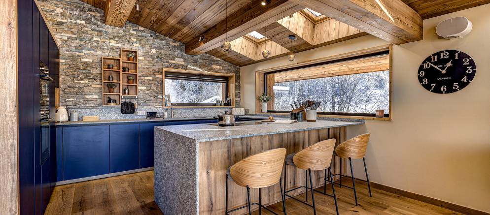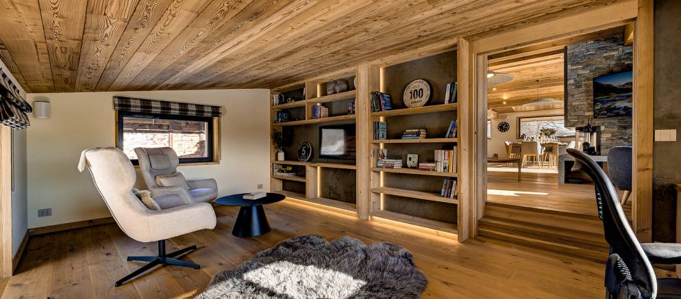 Large picture windows frame the Bossons glacier and surrounding peaks that can be gazed upon whilst dining at the large table. The adjacent open kitchen with breakfast bar is fully equipped for home cooking. Tucked away just off the lounge, and down a couple of steps, is a dedicated office for those who need to keep up to date during their stay.