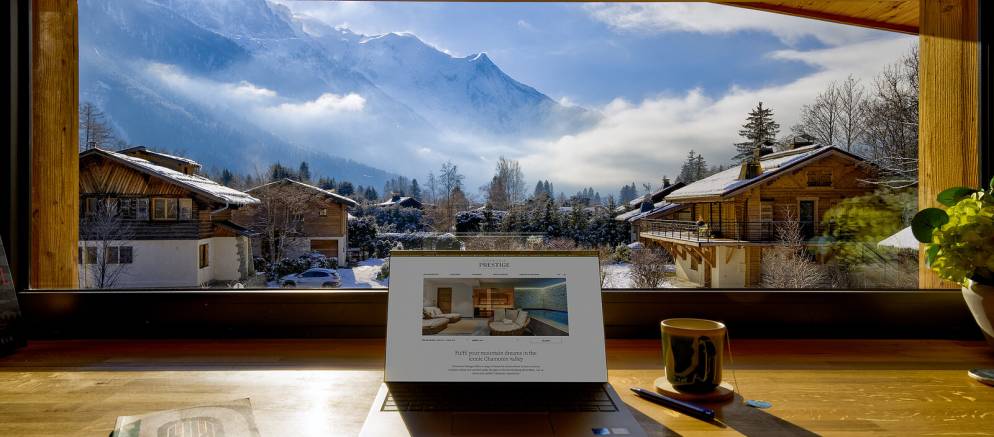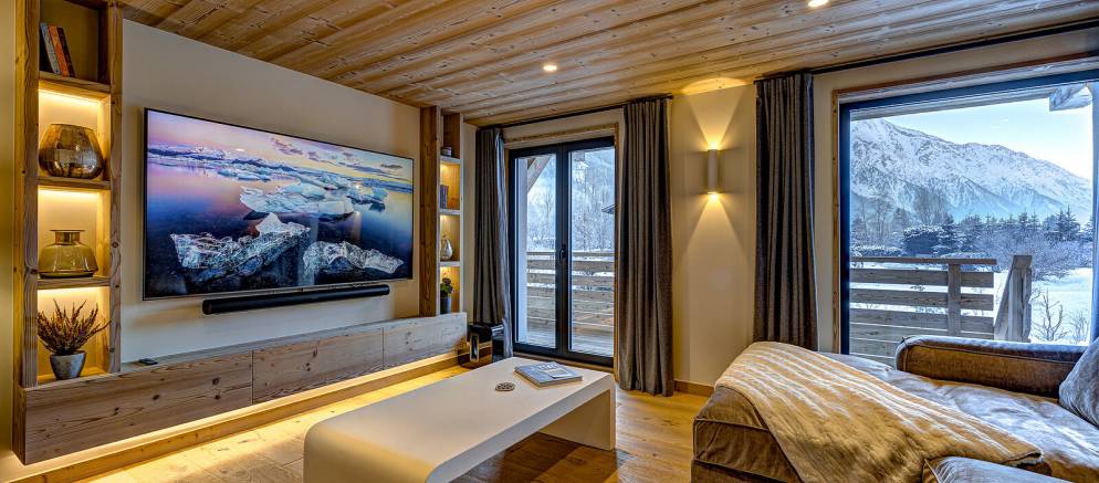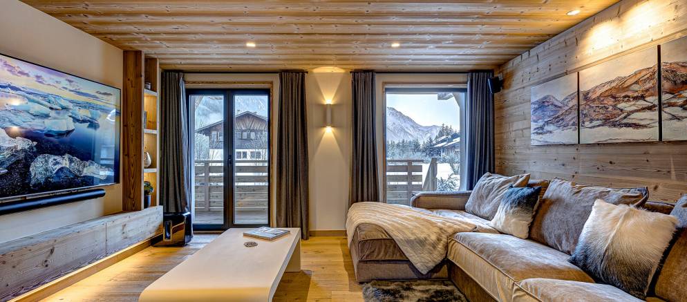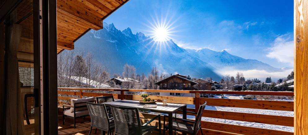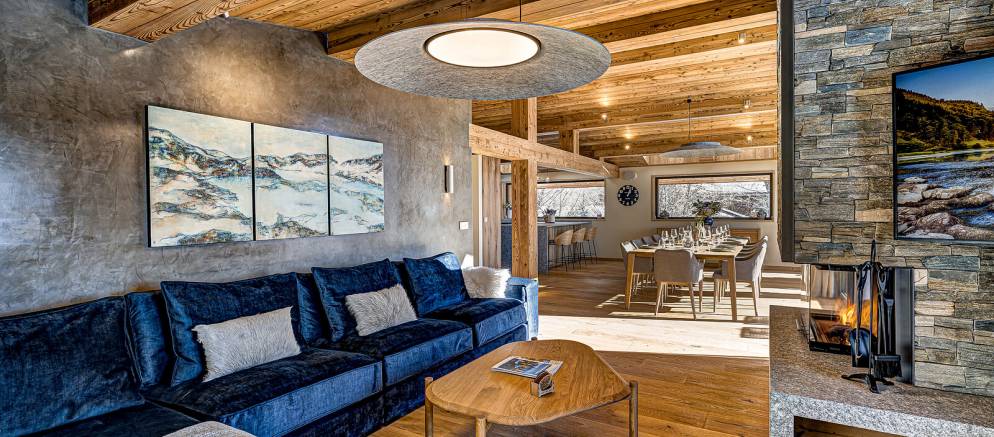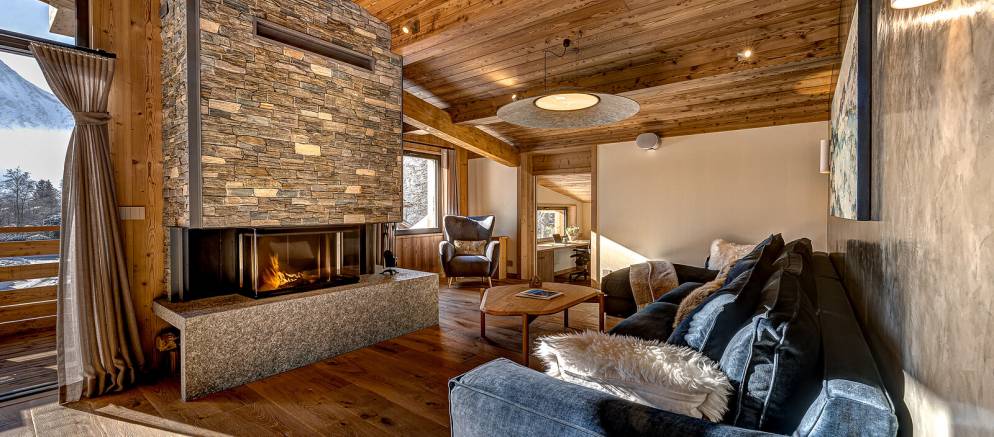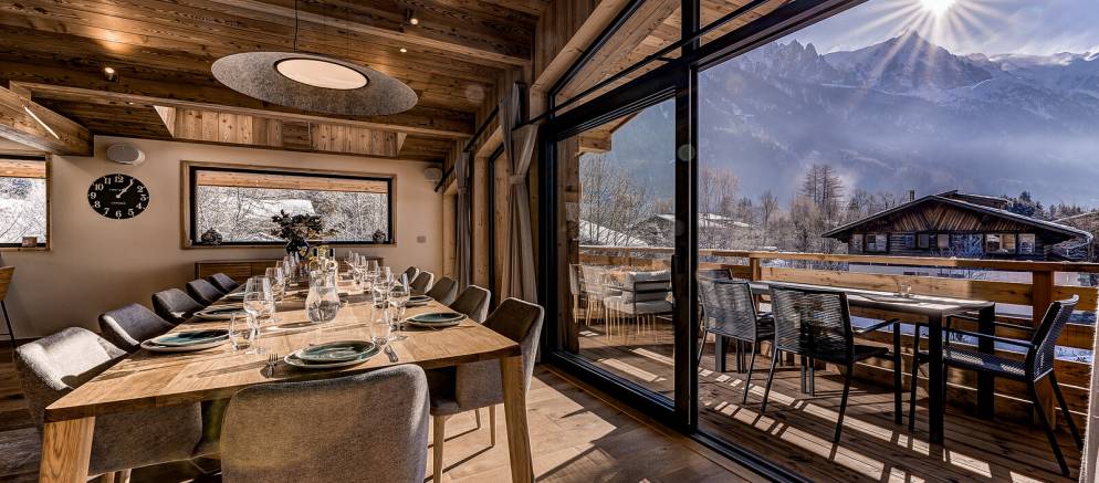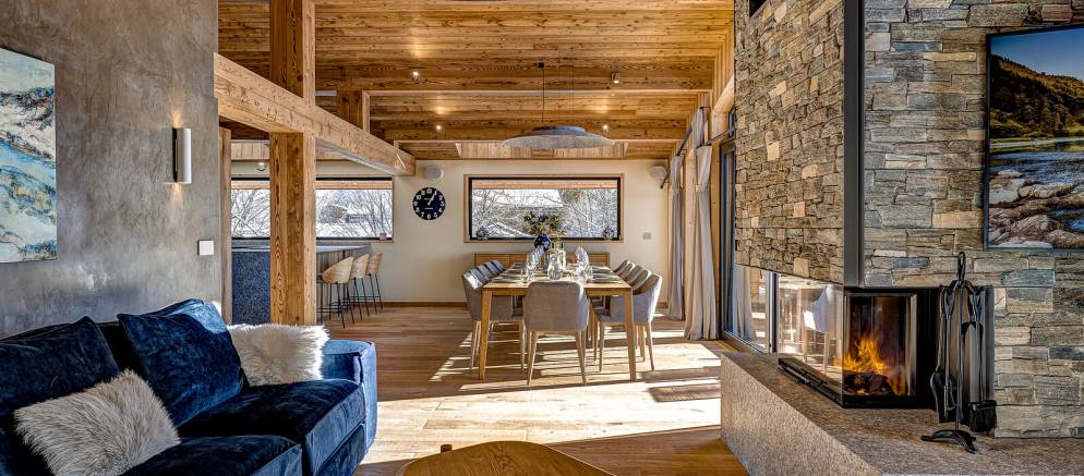 Arranged across three floors and 284m2 of floor area the impressive open plan living area is spread across the top floor. A wood burning fireplace creates focal point for cosy winter evenings with friends and family, and glass doors open onto a terrace with an outdoor dining space and beautiful views of the Mont Blanc range.