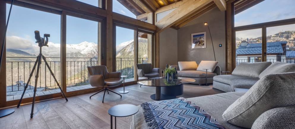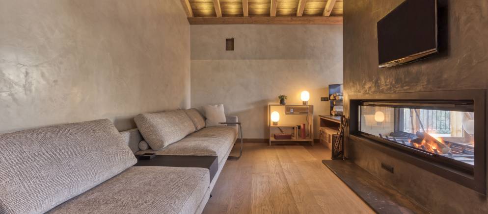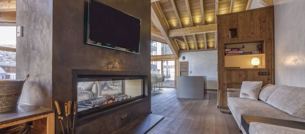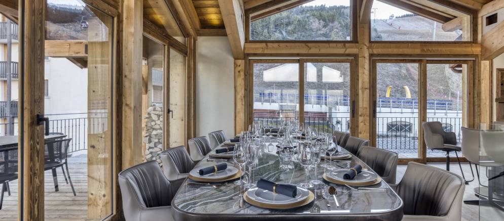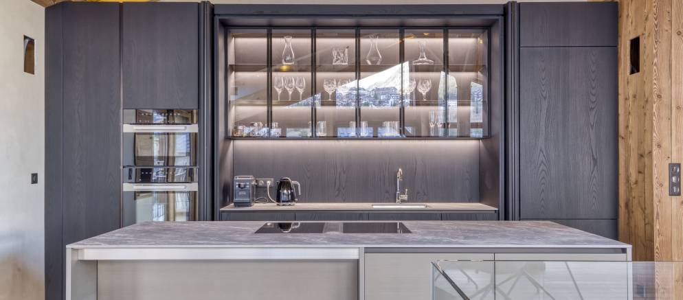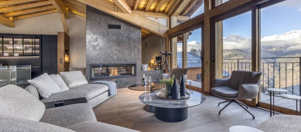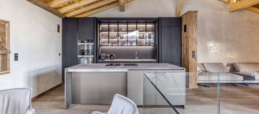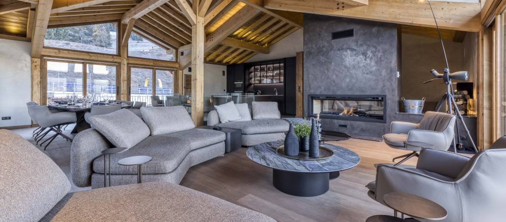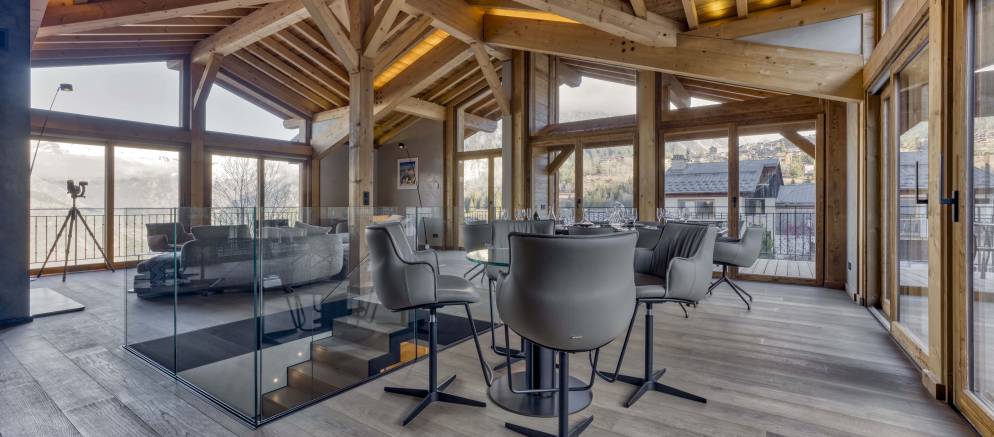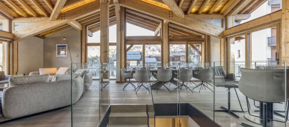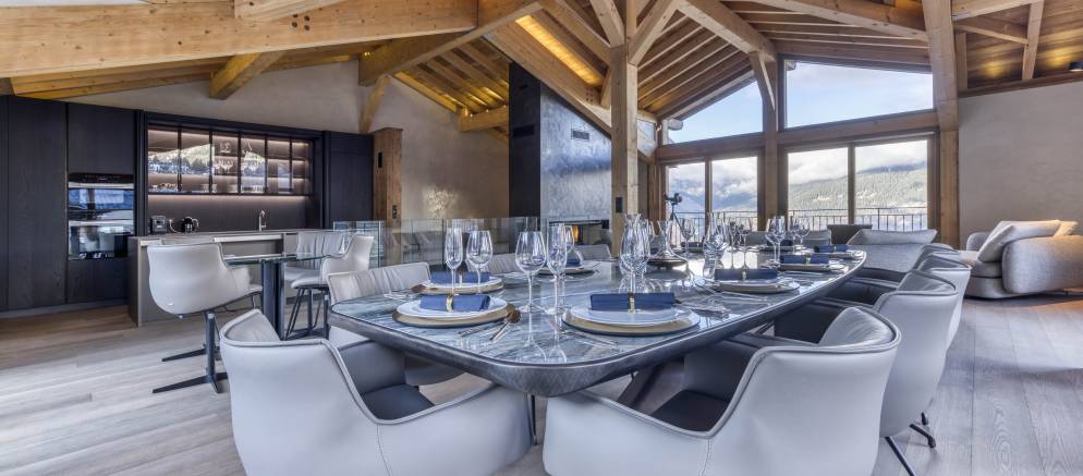 Up on the top floor and the dramatic open plan living spaces awaits your arrival. Set beneath the beautiful timber roof, large windows afford views across the mountains and onto the ski slopes. An expansive open-plan kitchen, dining and living area centred around a wood-burning fireplace offers plentiful space for all your group to come together.