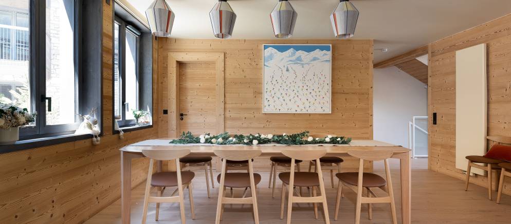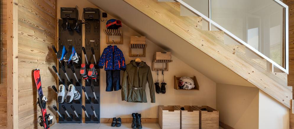 The chalet is arranged across three floors and 195m2 of floor area. Sleeping 6+4 guests in four en-suite bedrooms, the layout is ideal for a couple of families looking to holiday together. The entrance to the property is on the lowest floor where you have a hallway with ski rack, along with boot dryers and storage conveniently tucked away under the stairs.