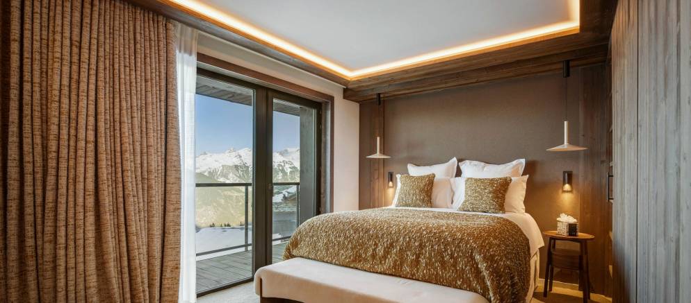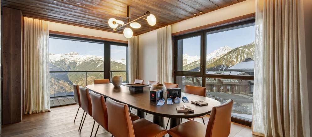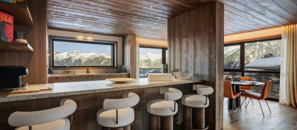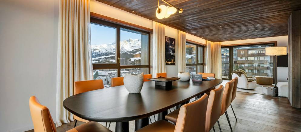 Apartment 602 is arranged on one level and offers 189m2 of floor area. Sleeping up to 8 guests in four en-suite bedrooms, there is 1 double bedroom and 3 twin/double bedrooms. The spacious open plan living space with lounge, dining, and kitchen with breakfast bar opens onto a wrap-around balcony. The layout works perfectly for a couple of families or a group of friends looking for centrally located luxury accommodation in Courchevel 1850.