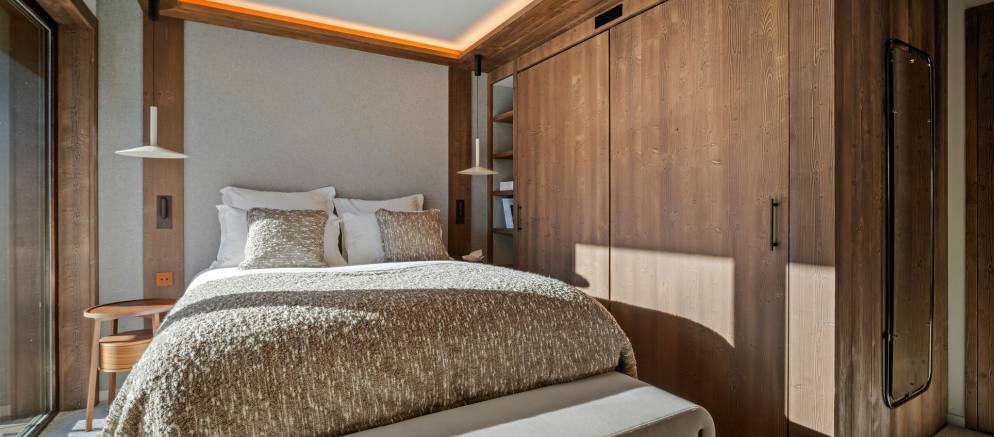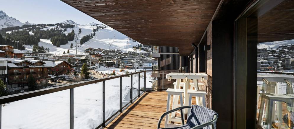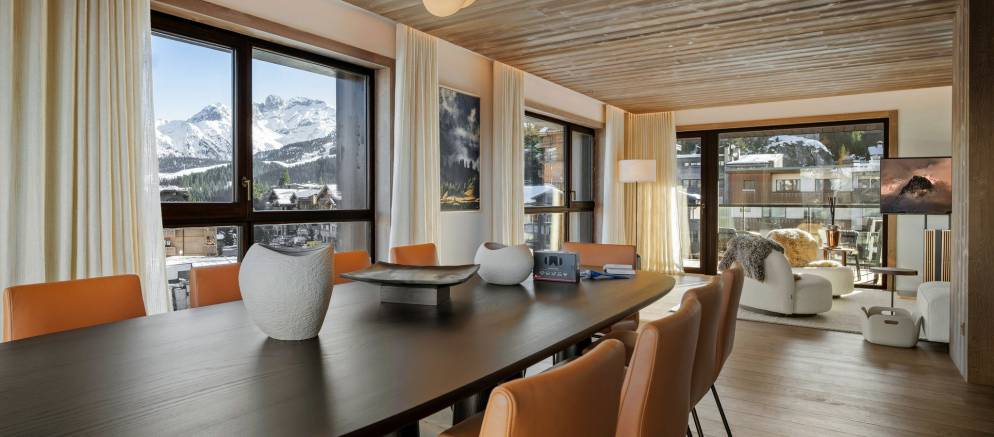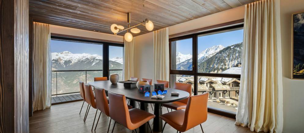 Apartment 702 is arranged on one level and offers 189m2 of floor area. Sleeping up to 8 guests in four en-suite bedrooms, there is 1 double bedroom and 3 twin/double bedrooms. The spacious open plan living space with lounge, dining, and kitchen with breakfast bar opens onto a wrap-around balcony. The layout works perfectly for a couple of families or a group of friends looking for centrally located luxury accommodation in Courchevel 1850.