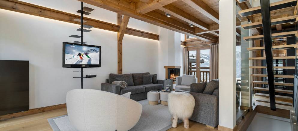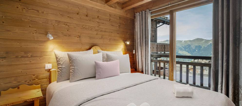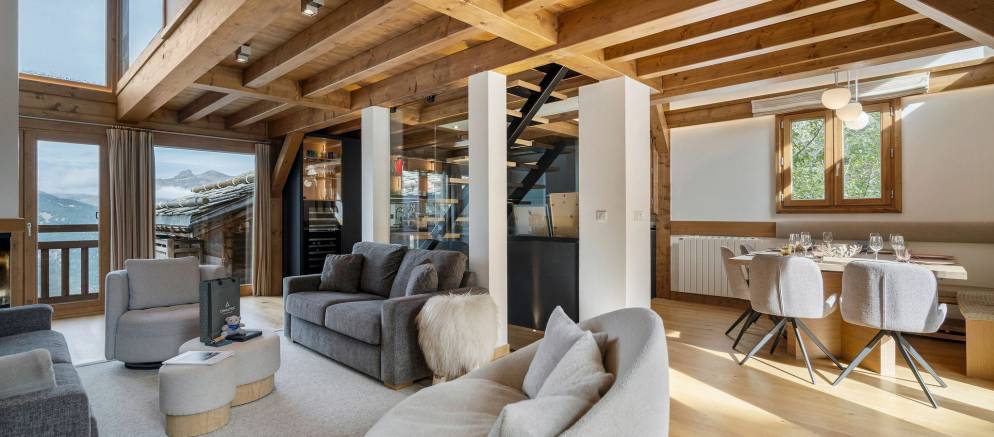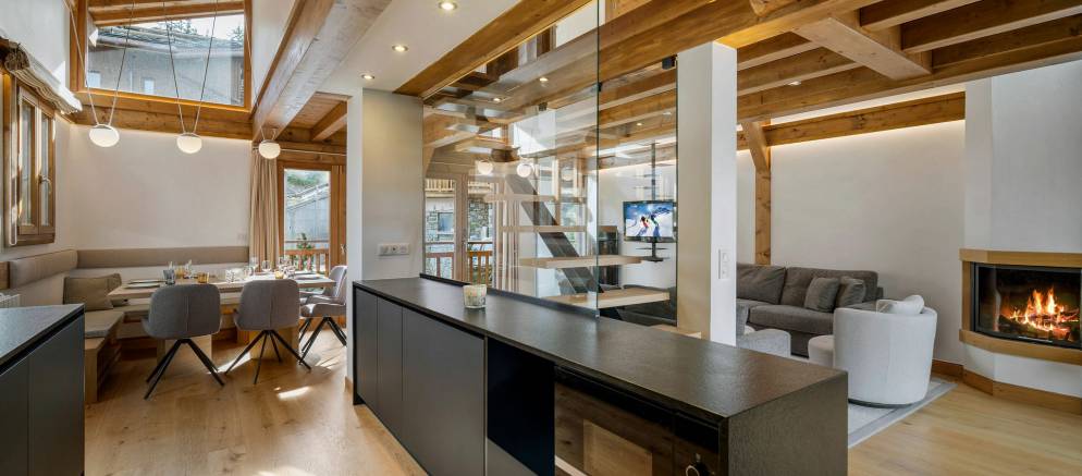 The chalet features a spacious and bright open plan living area with lounge and dining room, along with a fireplace that creates a warm and welcoming atmosphere after a day on the ski slopes. The fully equipped kitchen opens onto the living space, making is perfect for relaxed breakfasts and sharing convivial moments over dinner. A balcony offers views across the valley and mountains.