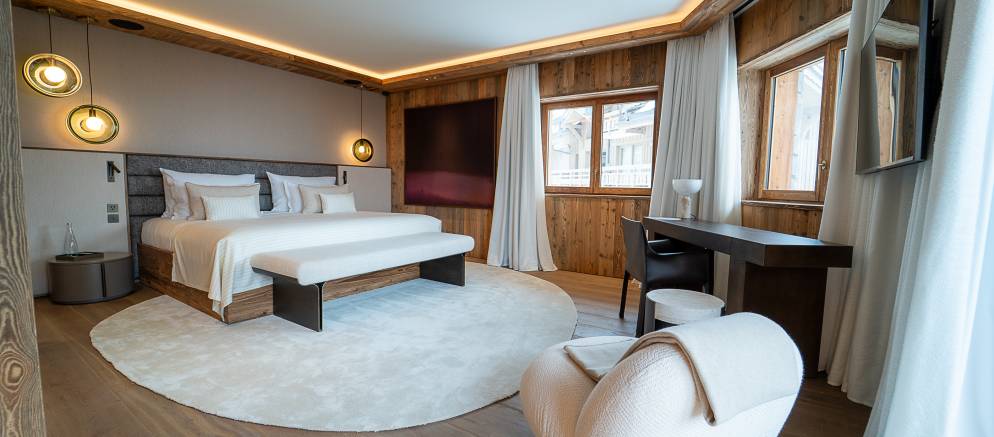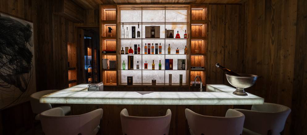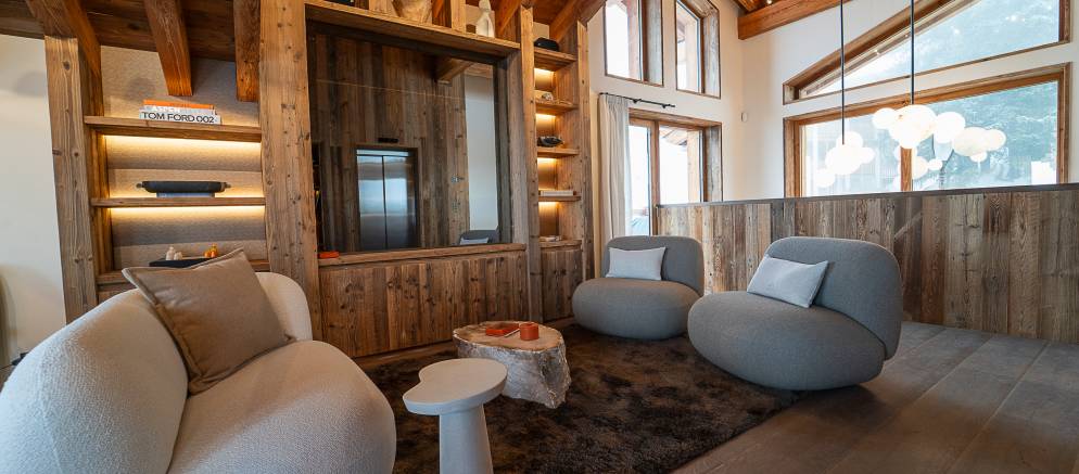 The living areas, arranged across the top floor, are designed for both relaxation and conviviality, with a spacious lounge centred around a contemporary fireplace, an inviting dining area, and an elegant bar. This space is just perfect for extending the evening in a cosy, intimate atmosphere, tucked away in the mountains away from the stresses of everyday life.