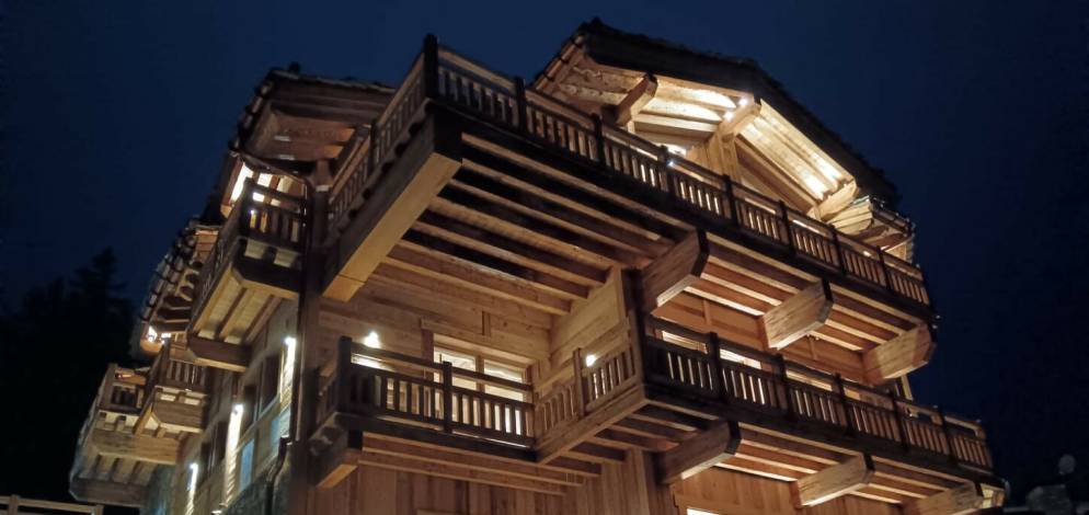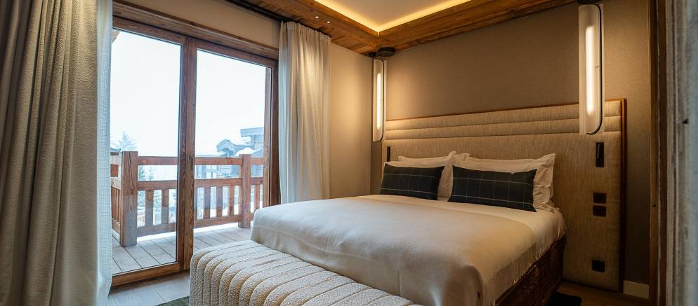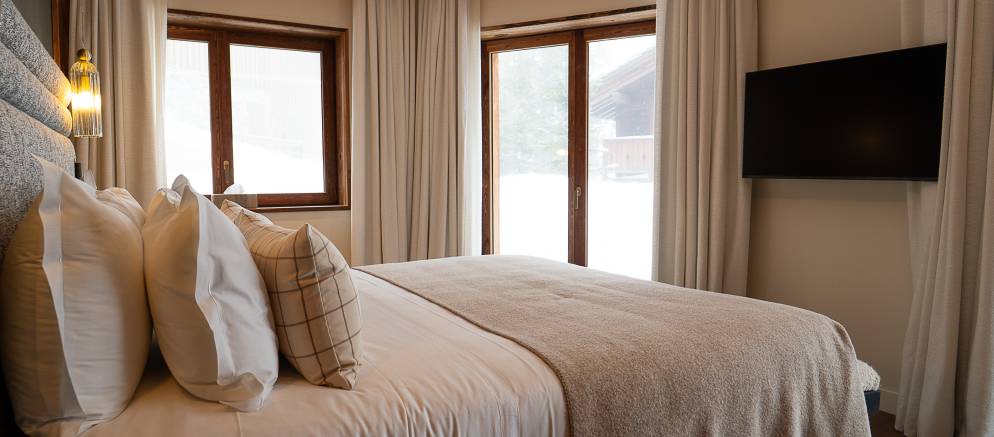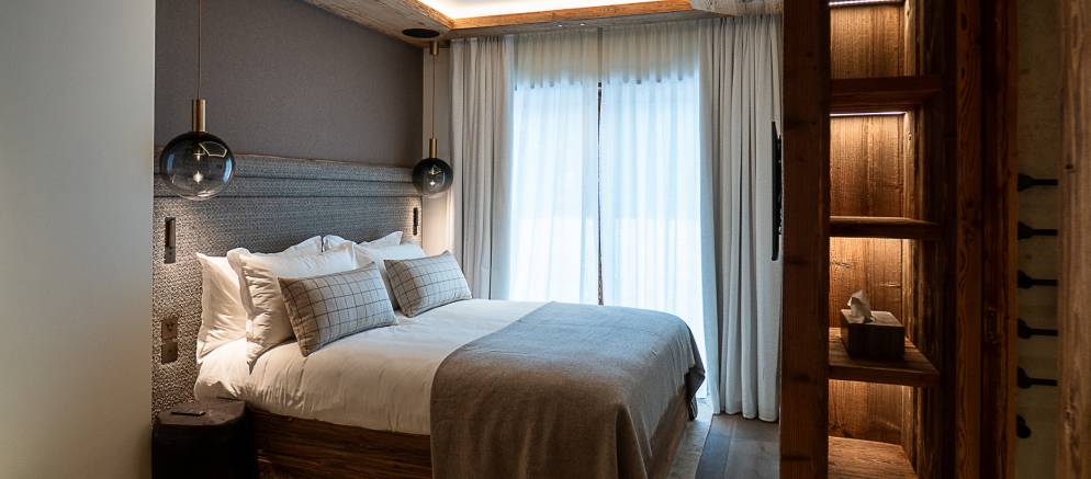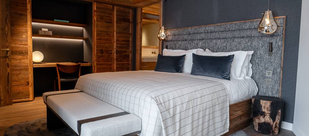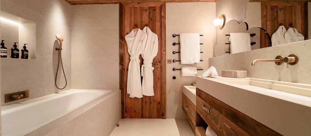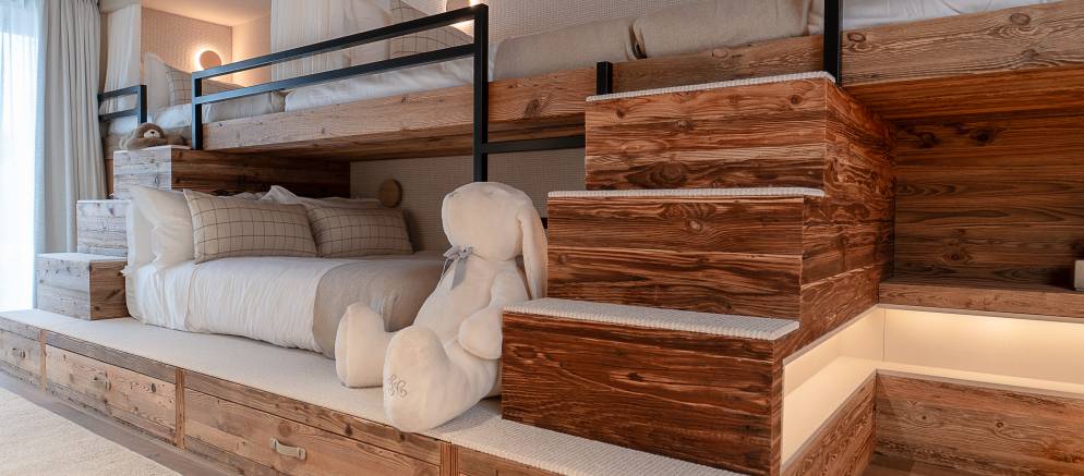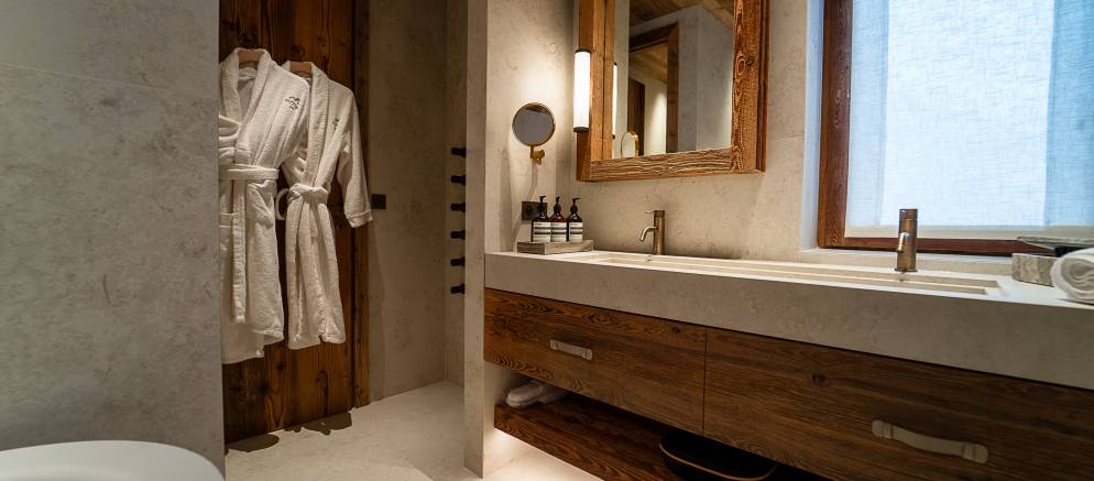 The chalet accommodates up to 14 guests across six double bedrooms and a dedicated family room. Each bedroom benefits from its own en-suite bathroom and ample storage space, ensuring privacy and comfort for every guest. The blend of wood and refined decorative touches creates a warm and elegant ambiance where modernity and comfort blend seamlessly.