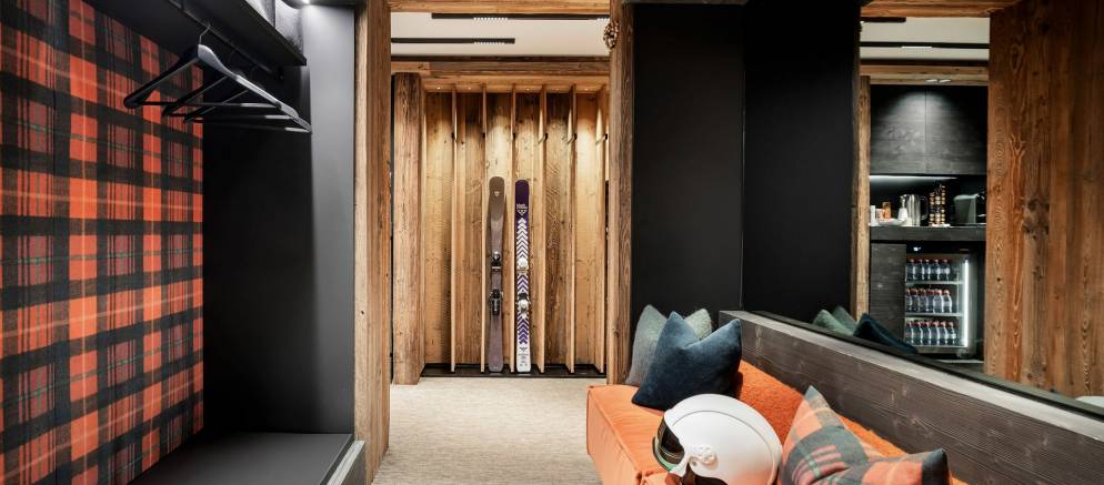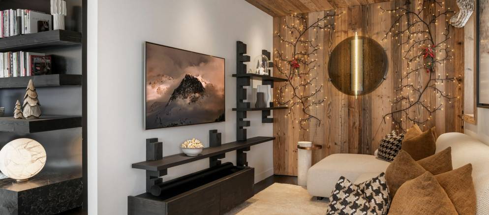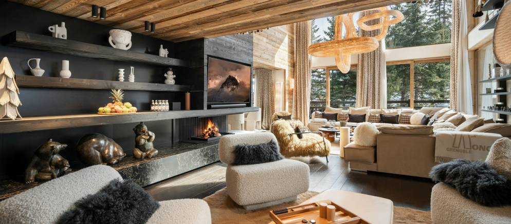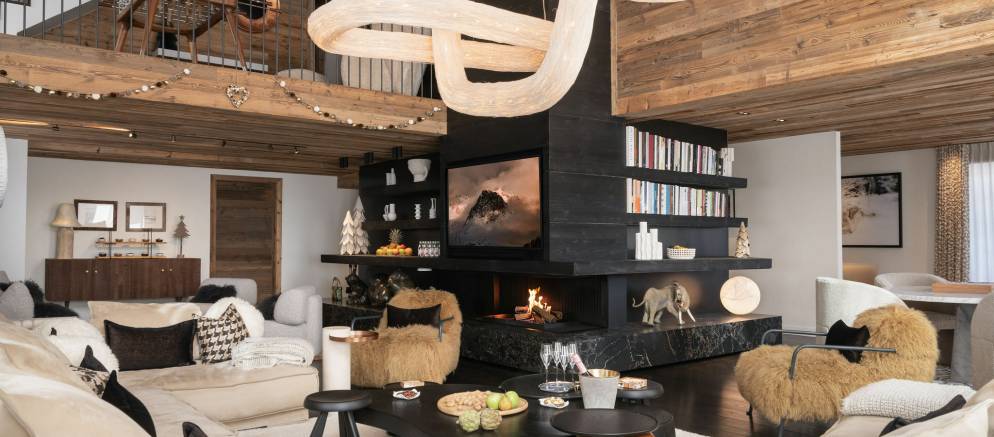 This extremely spacious chalet is spread across five floors and 984m2 all serviced by an elevator. The layout features generous, light-filled spaces, enhanced by natural materials, bespoke finishes, and warming tones. The inviting living areas, with several break our spaces, are enhanced by the central fireplace and large panoramic terraces.