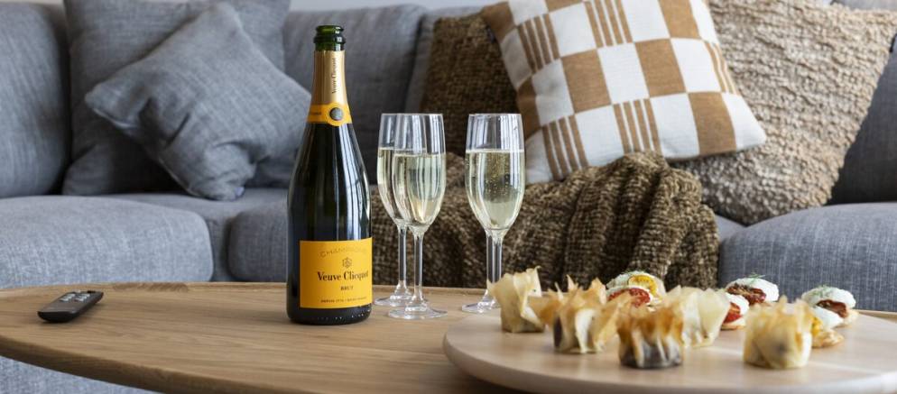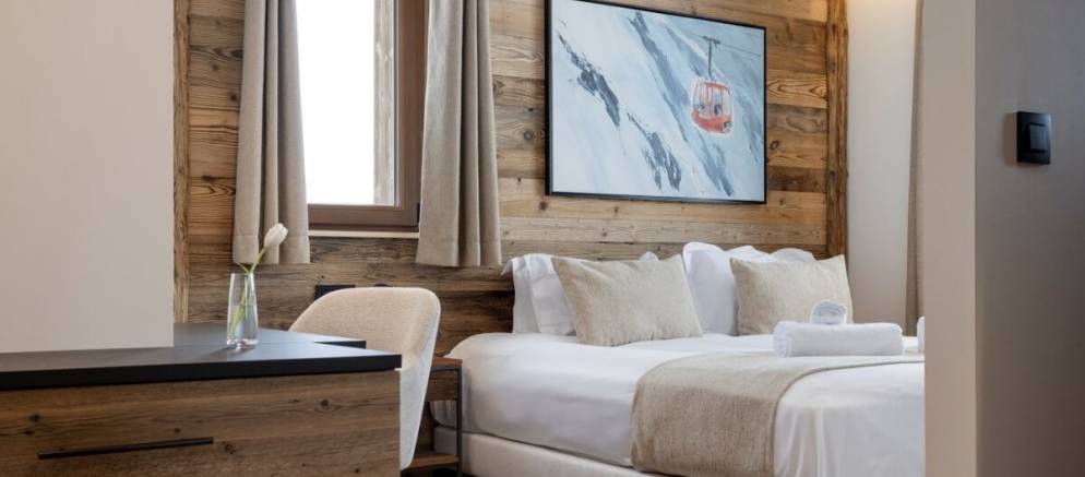 This suite boasts spacious interiors with floor-to-ceiling windows framing panoramic views of the slopes and mountains peaks, stretching all the way to Mont Blanc. Relax in your private hot tub, perfectly positioned to let you soak in the tranquil beauty of the mountains. Add in an eco-friendly fireplace and soft lighting all complemented by thoughtful touches like USB-C charging at your bedside and warm gloves ready each morning for an extremely comfortable ski holiday.