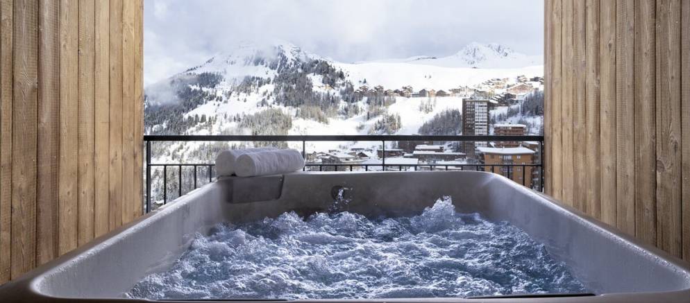 The elegantly designed interior of the Mio Suite has large windows that frame the panoramic view of the ski slopes and mountain tops that stretch as far as Mont Blanc. Your private terrace also has a private hot tub if you want to blend the view with hot bubbles. Add in comfy sofas, an eco-fireplace, discrete lighting, along with USB-C by your bedside and warm gloves in the morning, and you have all you need for a very comfortable ski holiday in La Plagne.
