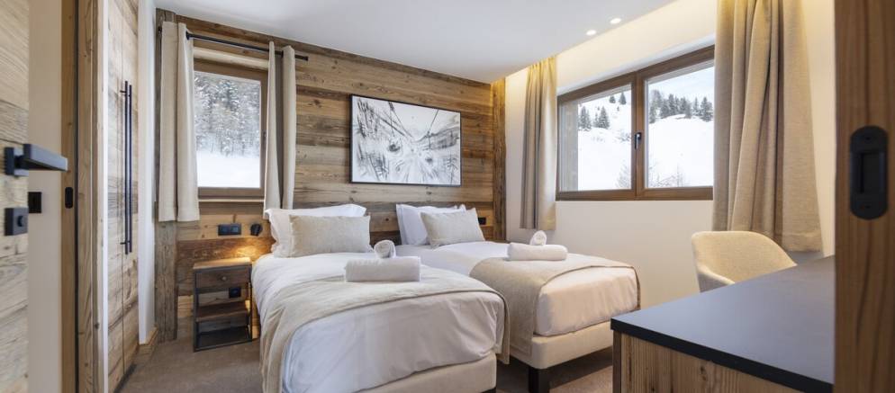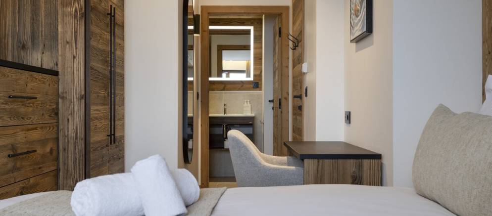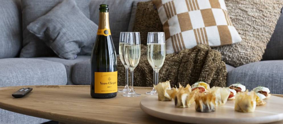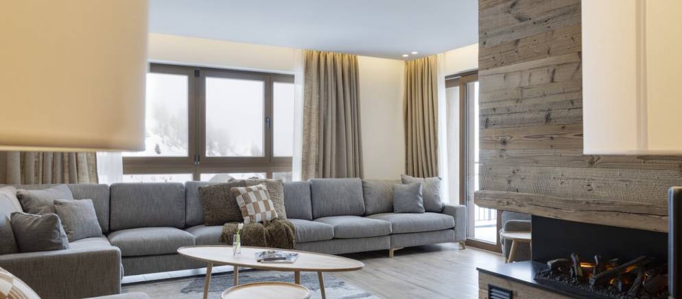 The suite has a spacious and beautifully designed interior with large windows that frame stunning views of the piste and mountain peaks. Once back from the ski slopes of the extensive Paradiski area, sink into your private outdoor hot tub while savouring the stunning scenery. The interior is equipped with cosy sofas, an eco-friendly fireplace, and subtle lighting all complemented by thoughtful touches like USB-C charging at your bedside and warm gloves ready each morning.