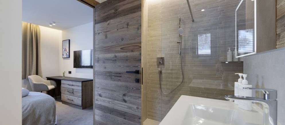 The Mont Blanc Suite sleeps from 8-14 guests with a flexible rooming arrangement. There are two bedrooms with double or twin beds and en-suite shower room, one family suite with double or twin beds, en-suite bath & shower room and separate curtained area with full sized bunk beds, and one family suite with double or twin beds, en-suite shower room and separate curtained area with two full sized bunk beds.