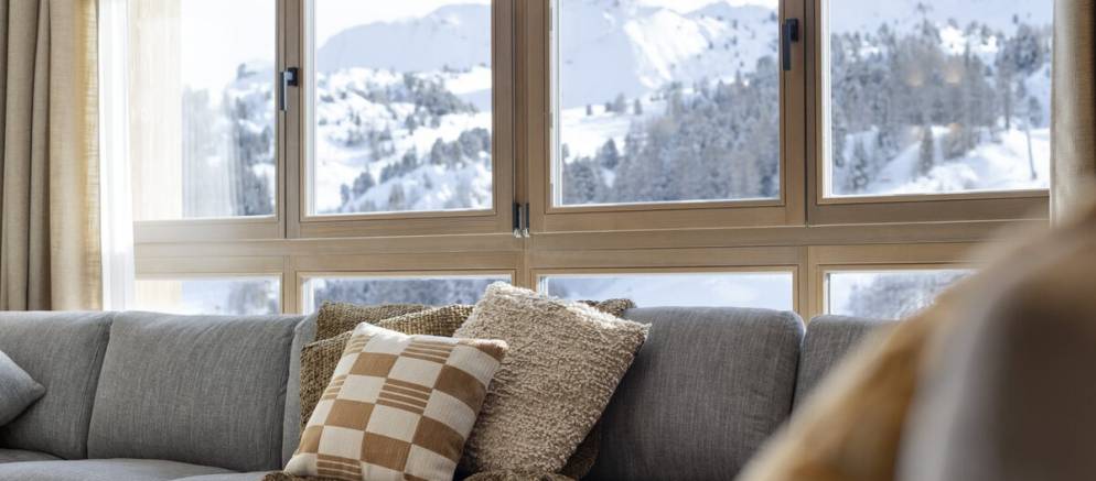 The suite has a spacious and elegantly designed interior with large windows that frame stunning views of the piste and mountain peaks. Once back from the ski slopes of the extensive Paradiski area, sink into your private outdoor hot tub and blend the view with hot bubbles. The interior is equipped with cosy sofas, an eco-friendly fireplace, and subtle lighting all complemented by thoughtful touches like USB-C charging at your bedside and warm gloves ready each morning.