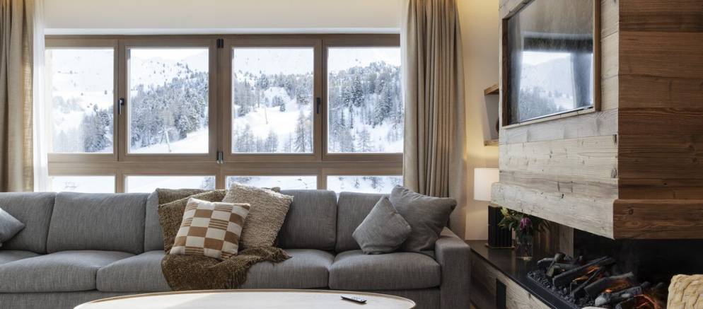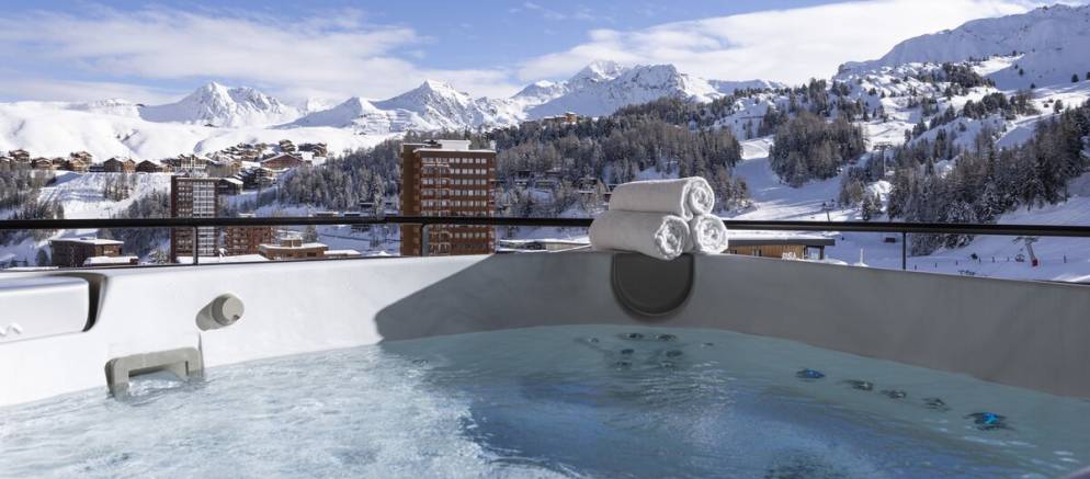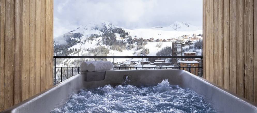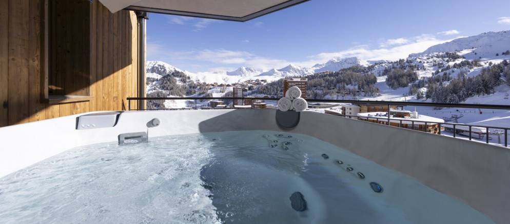 The elegantly designed interior of the Paradiso Suite has large windows that frame the panoramic view of the ski slopes and mountain tops that stretch as far as Mont Blanc. Your private terrace also has a private hot tub if you want to blend the view with hot bubbles. Add in comfy sofas, an eco-fireplace, discrete lighting, along with USB-C by your bedside and warm gloves in the morning, and you have all you need for a very comfortable ski holiday in La Plagne.
