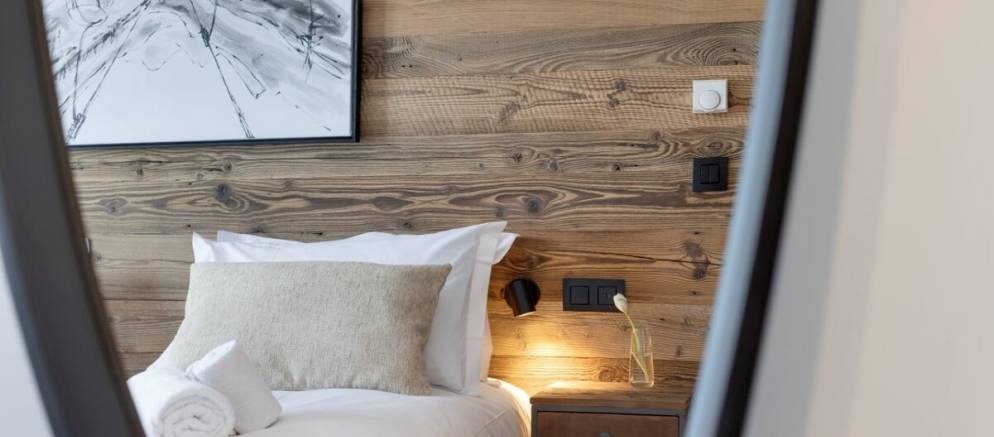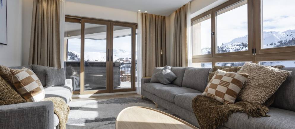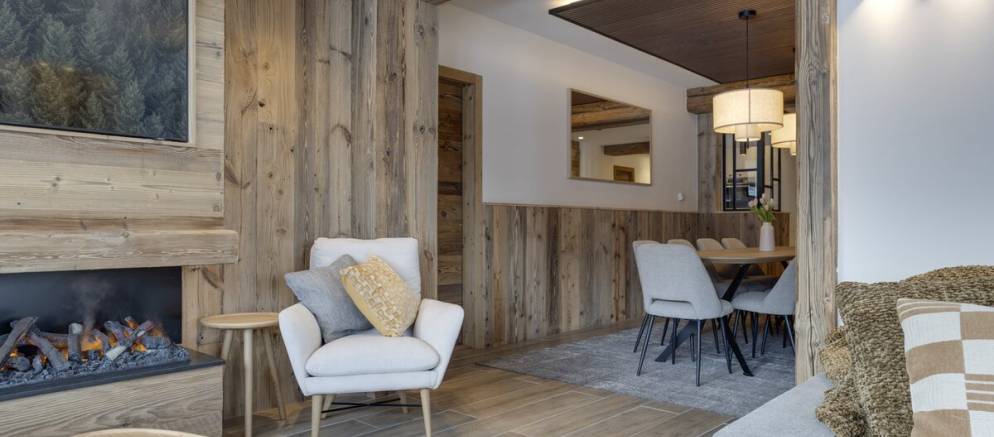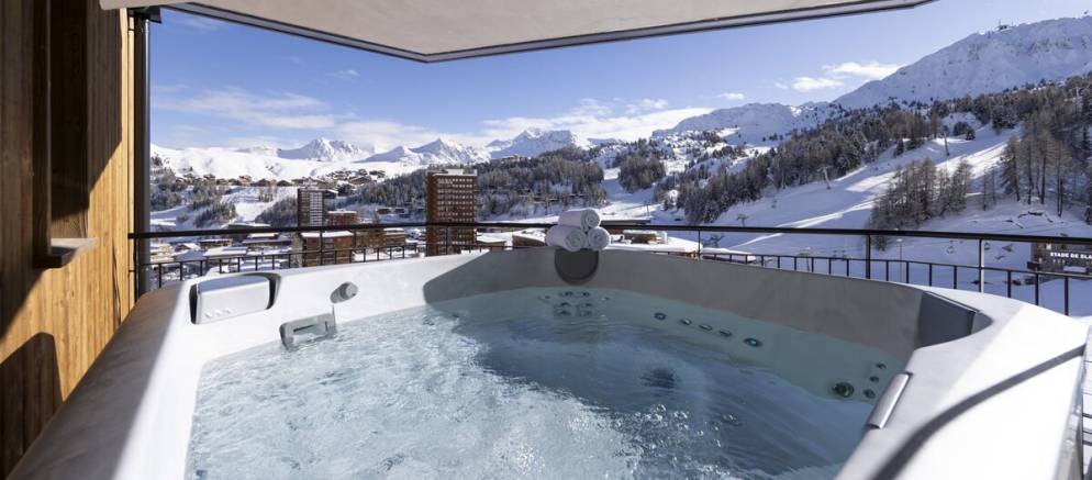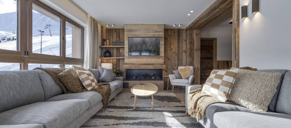 The suite has a comfortably designed interior with large windows that frame stunning views of the piste and mountain peaks. Once back from the ski slopes of the extensive Paradiski area, sink into your private outdoor hot tub and blend the view with hot bubbles. The interior is equipped with inviting sofas, an eco-friendly fireplace, and soft lighting all complemented by thoughtful touches like USB-C charging at your bedside and warm gloves ready each morning.