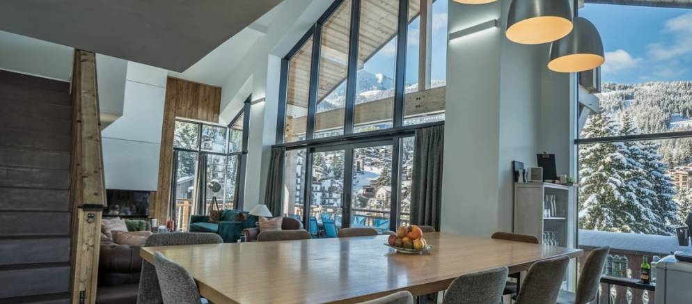 The chalet is arranged over three floors and can accommodate up to 10-12 guests in 6 bedrooms, all with either double or twin beds. The open plan living and dining room as well as the kitchen are located on the middle floor where a huge double height ceiling and large picture windows afford dramatic views over the resort and mountains.