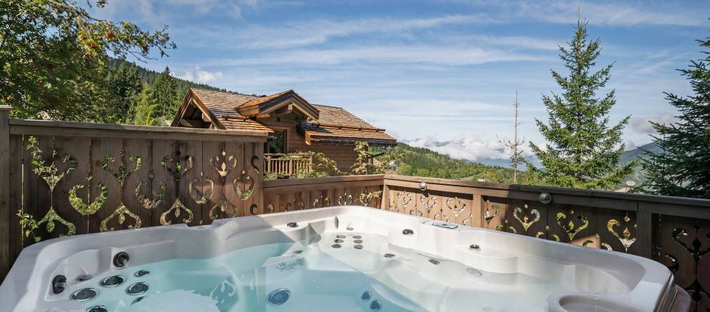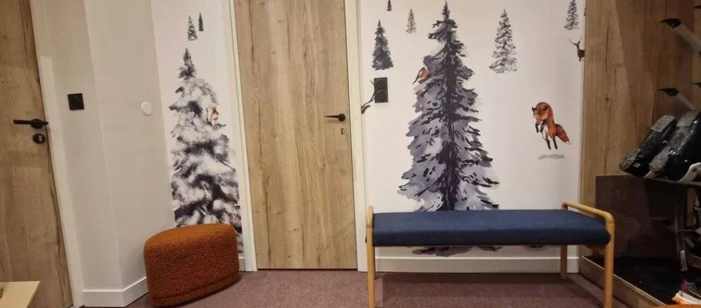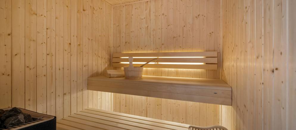 On the lowest level is your private wellness area with a sauna and outdoor hot tub, along with two bedrooms, one of which is a family room. On the ground floor, there are three double bedrooms with en-suite facilities, along with a ski room with a separate entrance ensuring comfort and convenience.