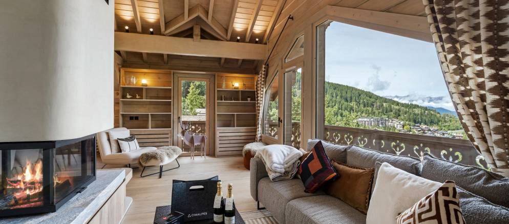 The large, open plan, lounge and dining area has a huge roaring fire, and leads out onto the large terrace that surrounds the chalet, and on sunny days is the perfect place to enjoy your afternoon tea, whilst watching people ski past.