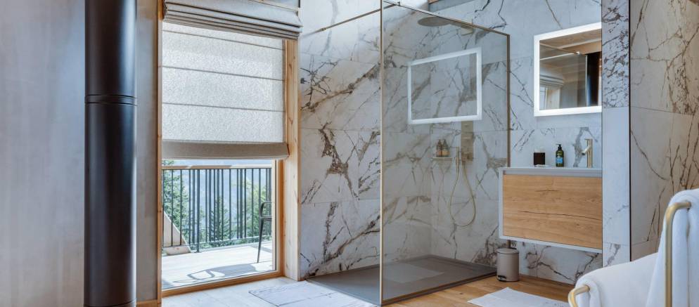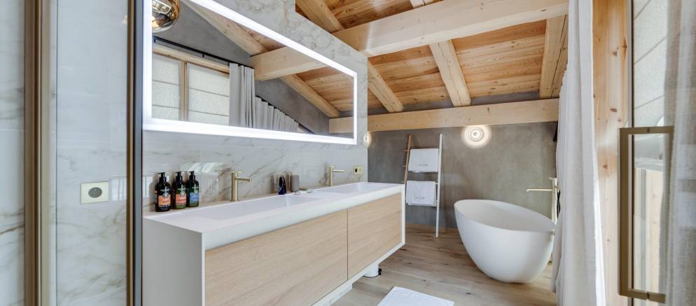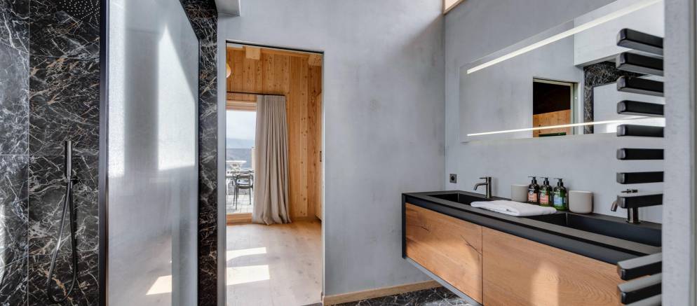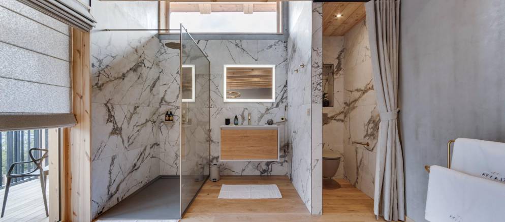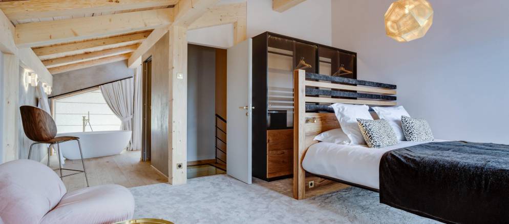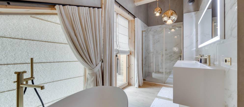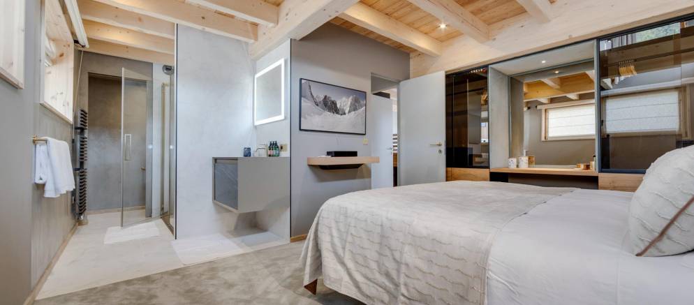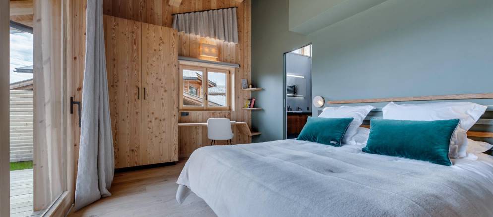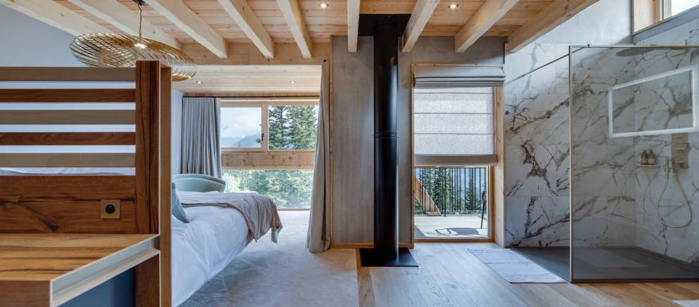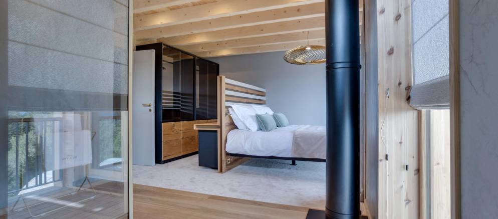 The next two bedrooms are on the middle floor of the chalet, and both are double rooms with en-suite shower rooms. The top floor is the preserve of the spacious master bedroom and features a small lounge area, balconies to the front and rear, bathroom with shower and bathtub, and a toilet.