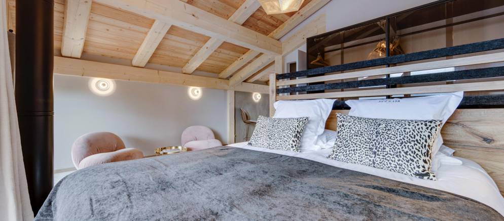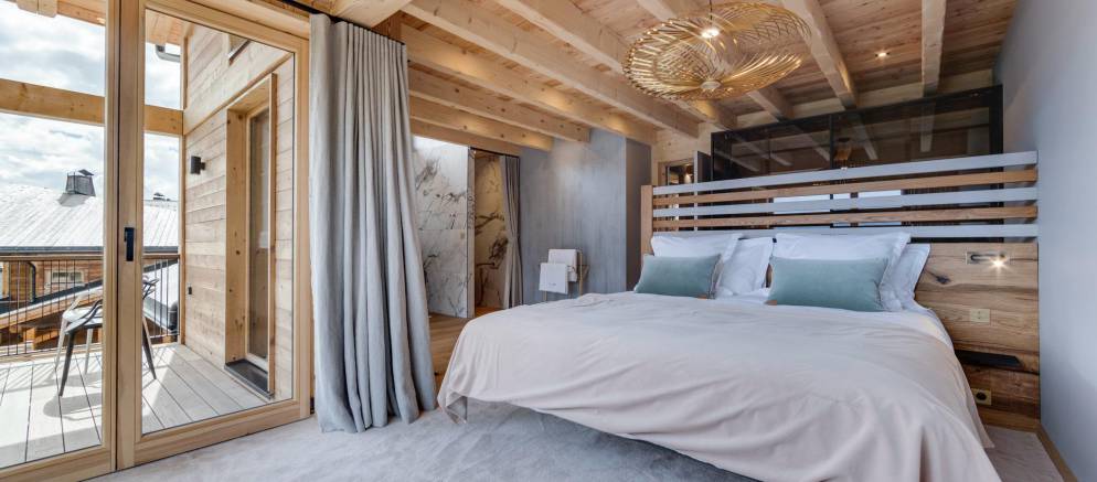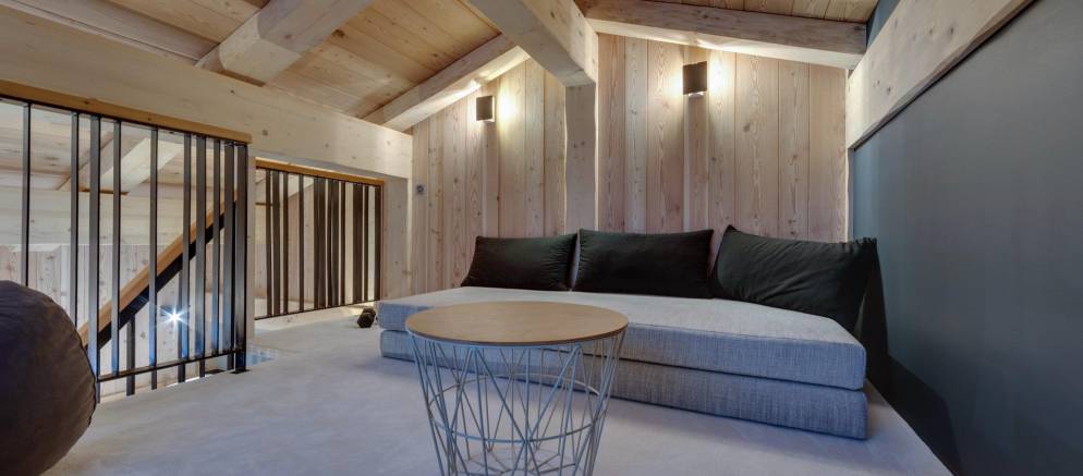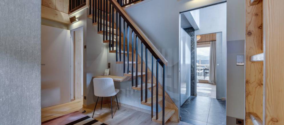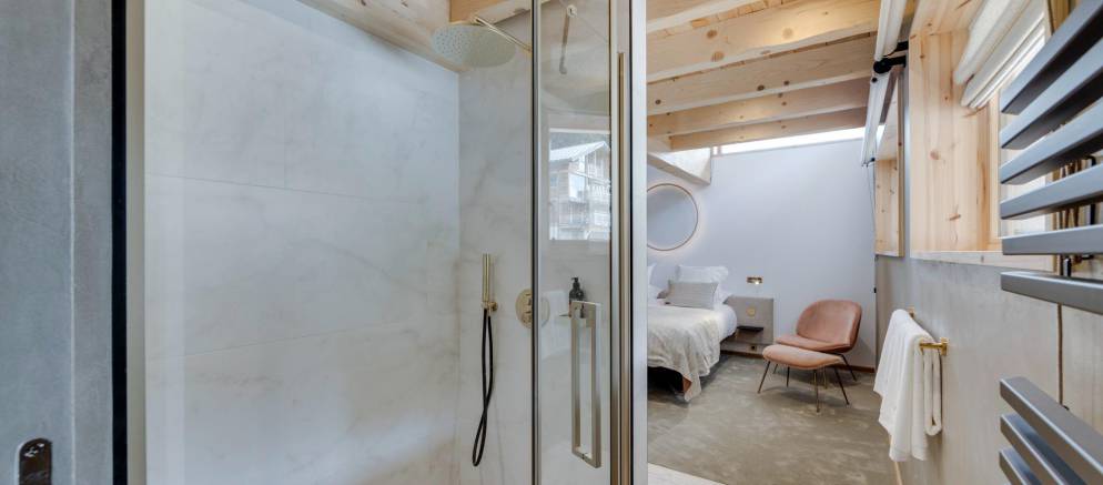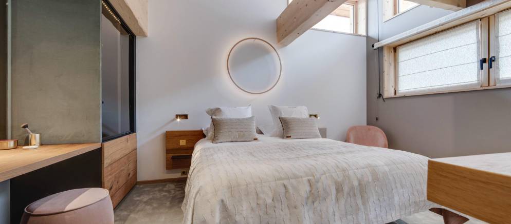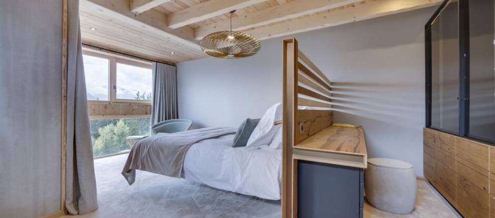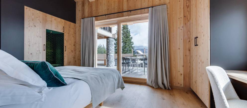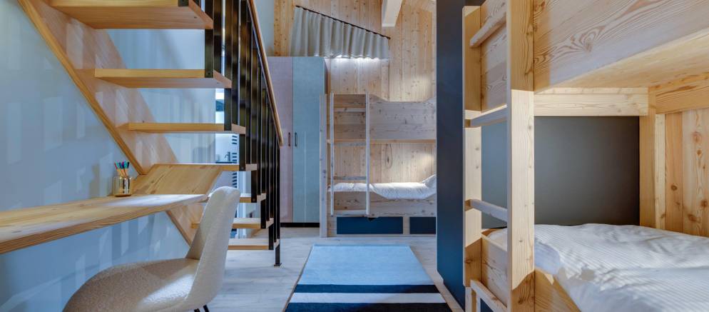 This semi-detached chalet is arranged over three floors and 200m2 of floor area. There are five bedrooms accommodating 8-12 guests. The chalet design takes inspiration from the pioneering architecture of Les Arcs, offering a calm and soothing ambiance. Lightly coloured wood and natural tones give way to fabulous panoramic views across the Tarentaise valley, which, thanks to the large windows, are also visible from inside.