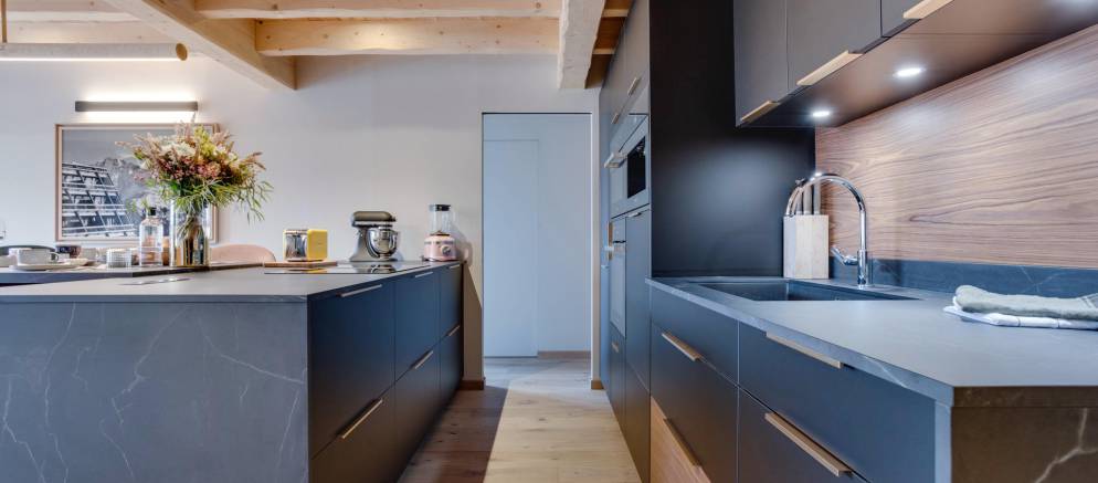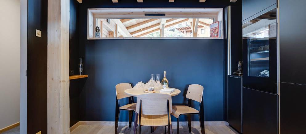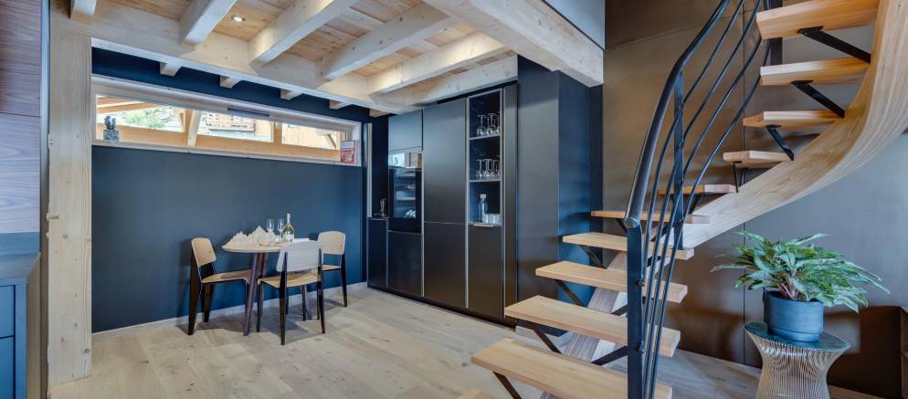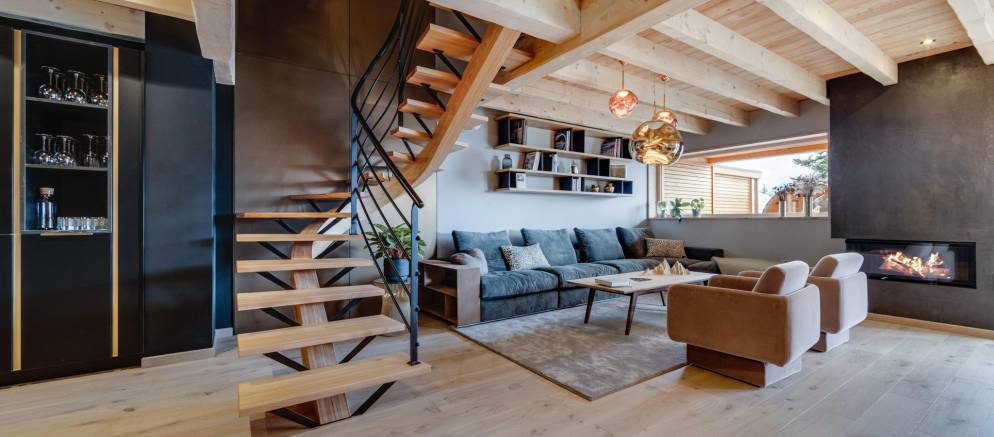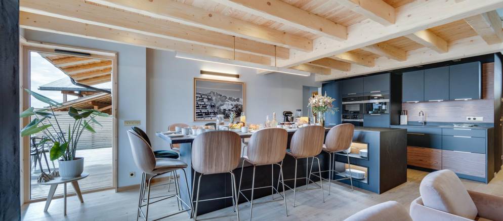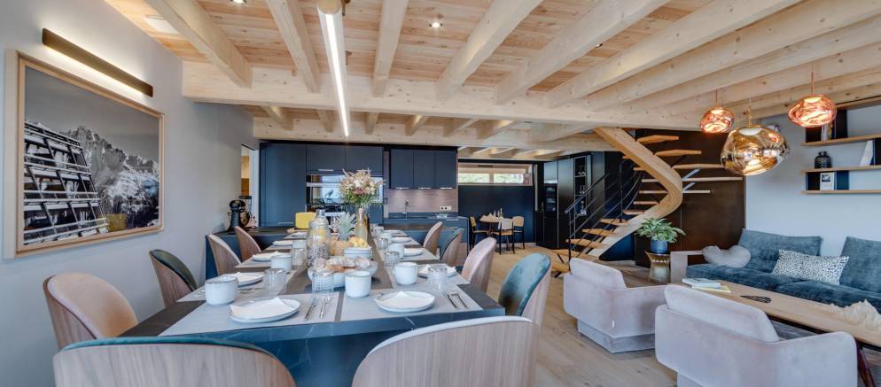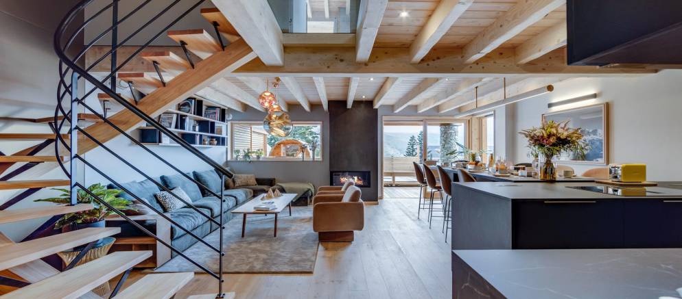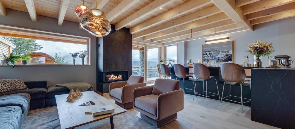 Entering the chalet on the ground floor you firstly arrive into a ski room / cloakroom where there is plenty of hooks for your mountain clothing. This room flows through to the open plan living spaces with a lounge with fireplace, kitchen with island unit and two separate and different sized dining tables. This space is very convivial and full of lovely designer touches and subtle lighting.