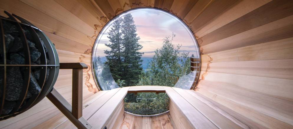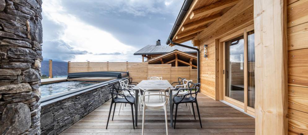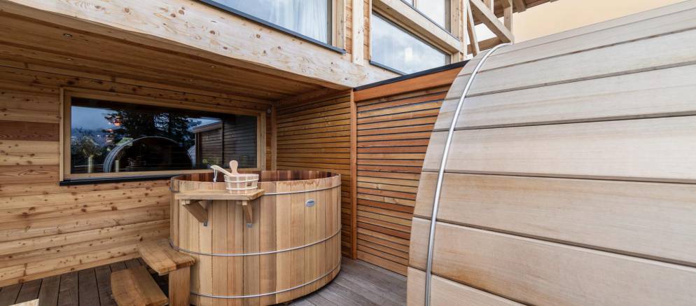 The living room opens out onto a wide terrace that invites you to unwind and refresh in an array of spa facilities. Take a dip in the swimming pool, let the warmth of the barrel sauna ease-tired muscles, before sinking into the fun of the Nordic hot tub. In the warmer spring months, the outdoor dining table invites you to dine al fresco.