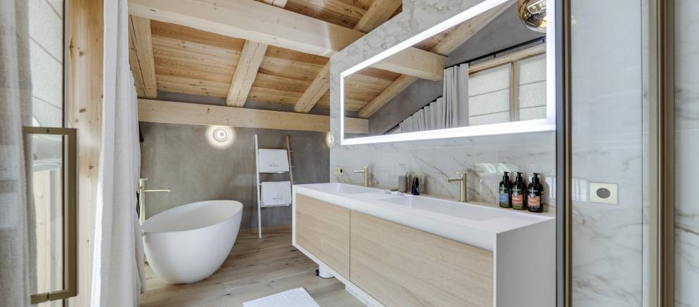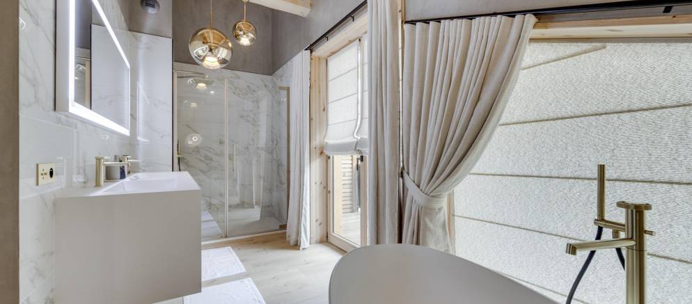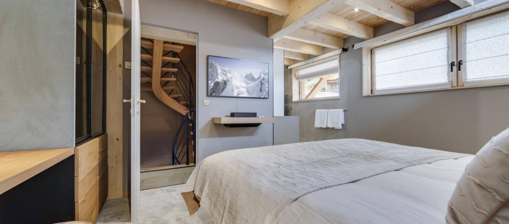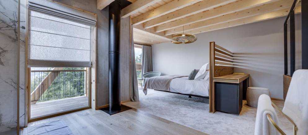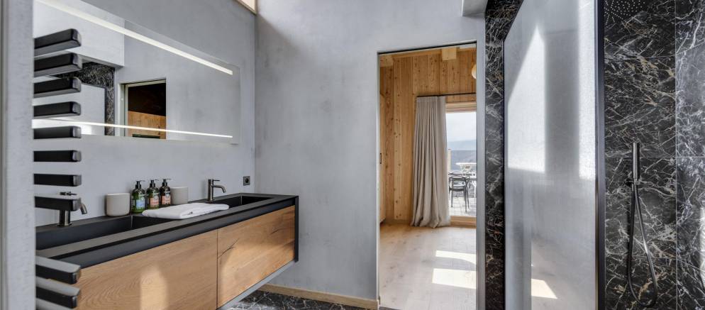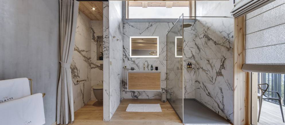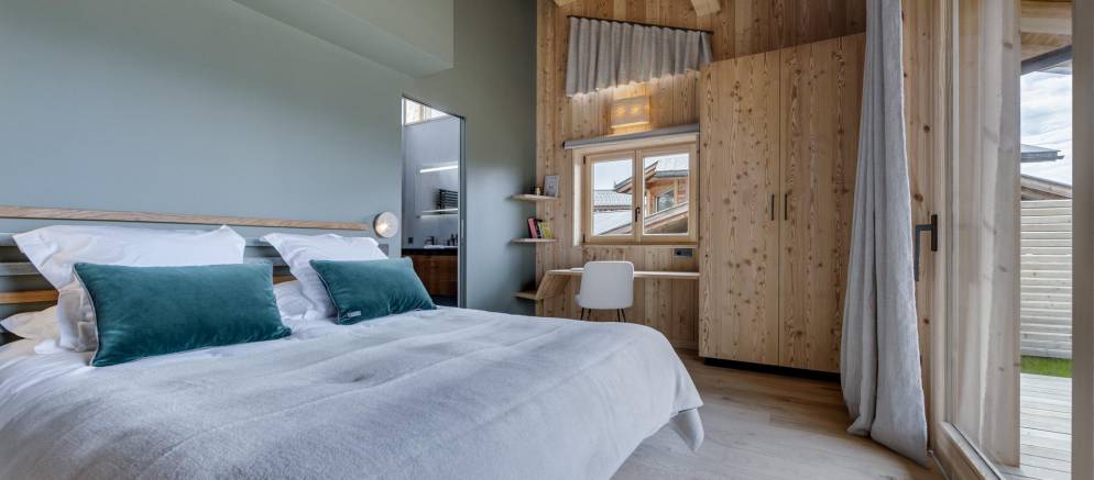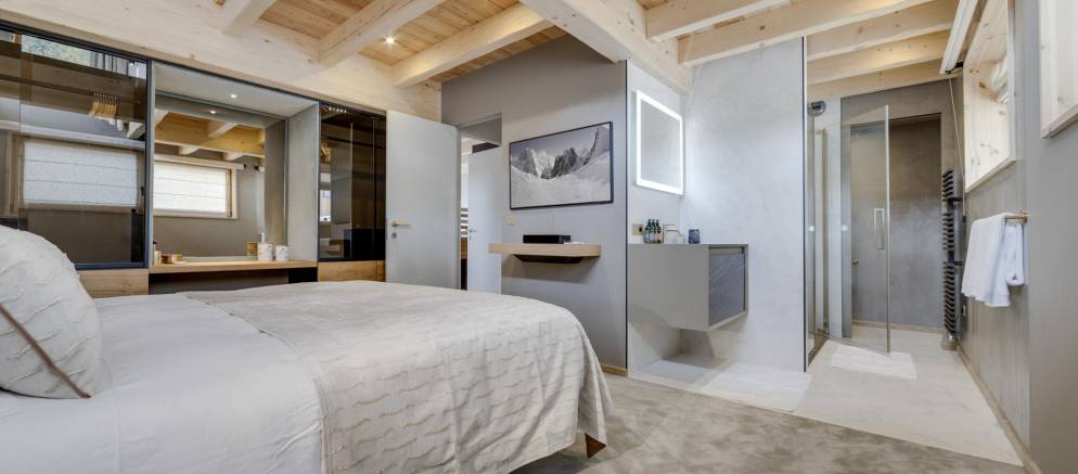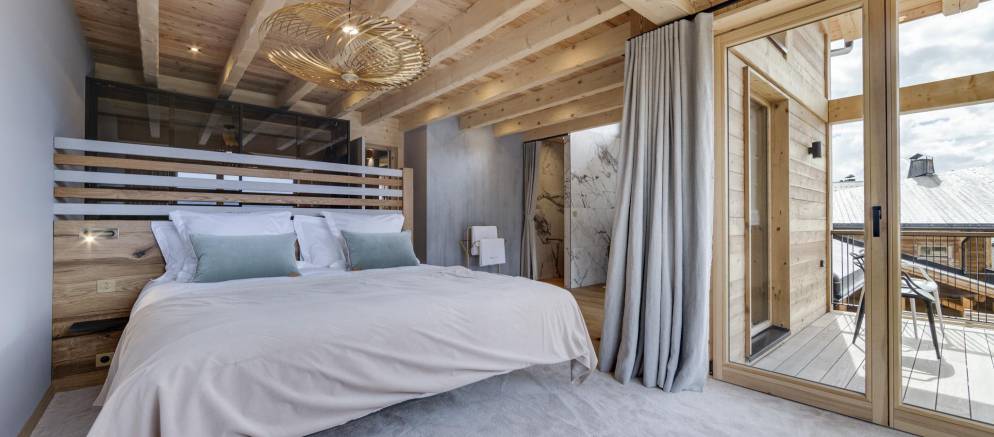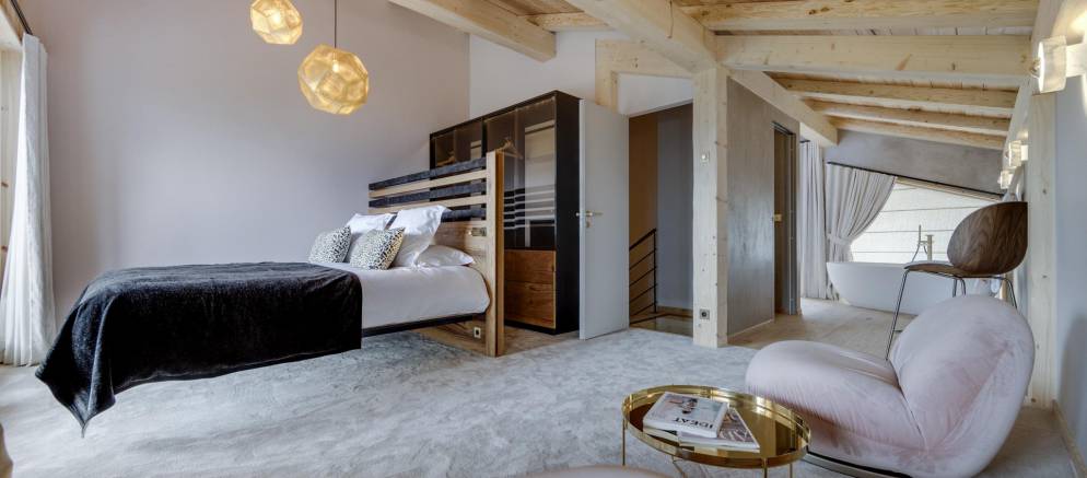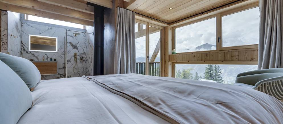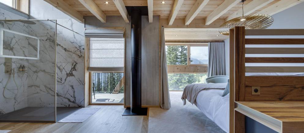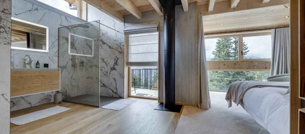 The next two bedrooms are on the middle floor of the chalet, and both are double rooms with en-suite shower rooms. The top floor is the preserve of the spacious master bedroom and features a small lounge area, balconies to the front and rear, bathroom with shower and bathtub, and a toilet.