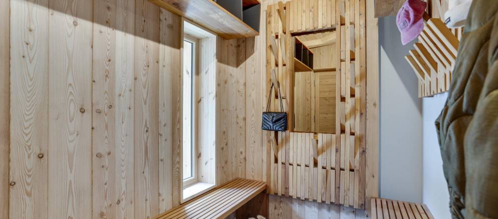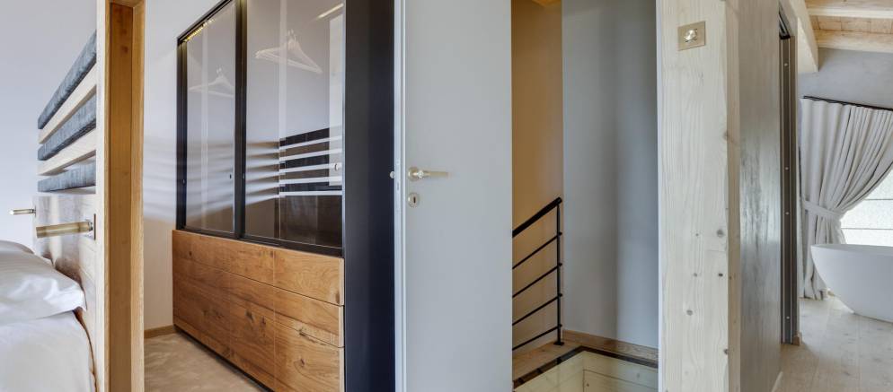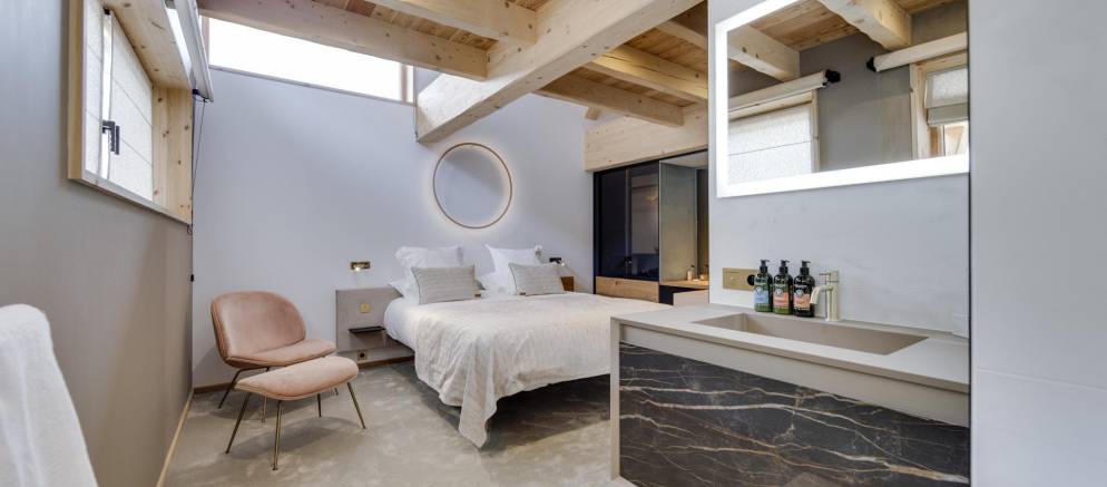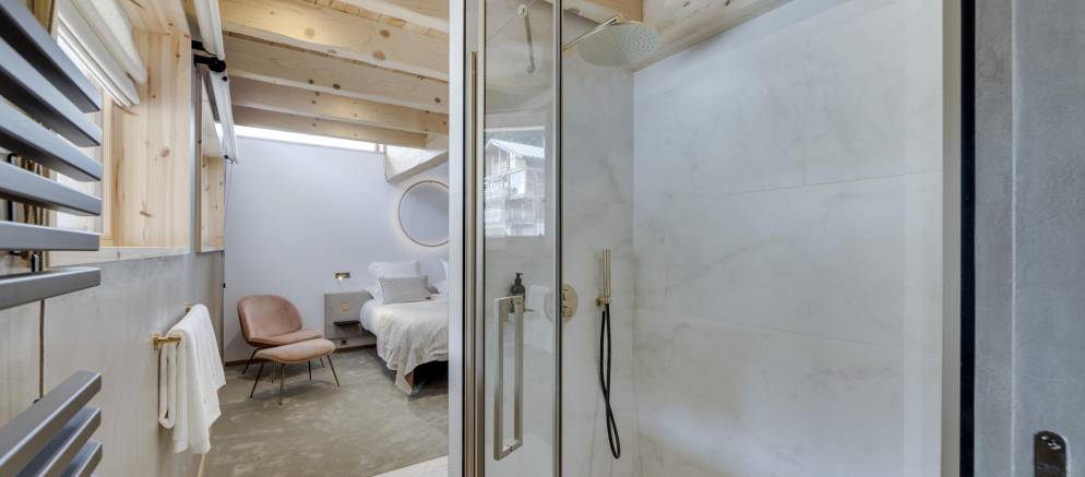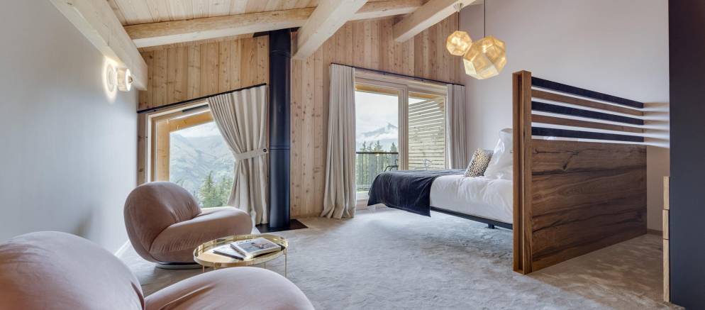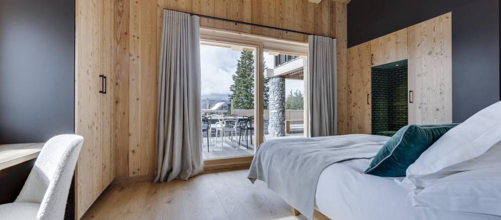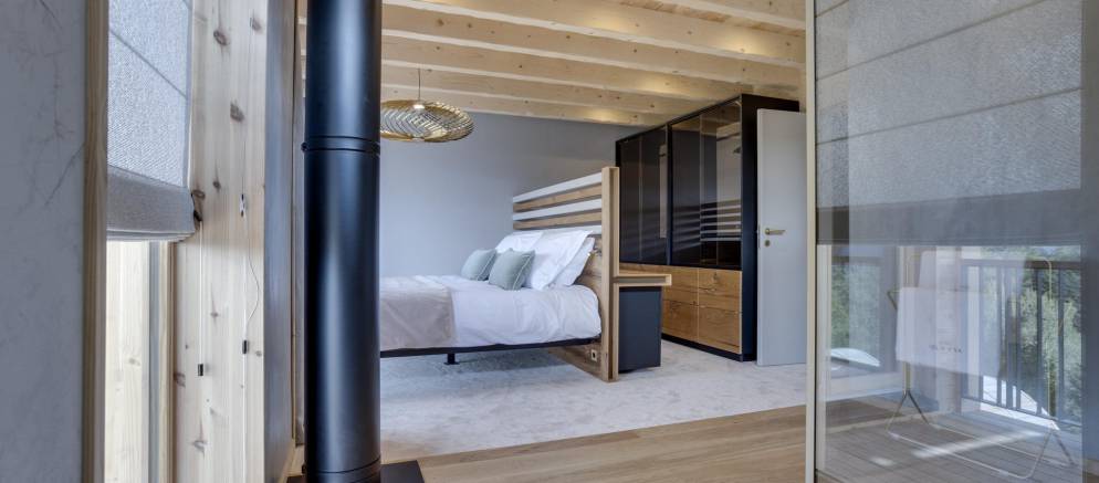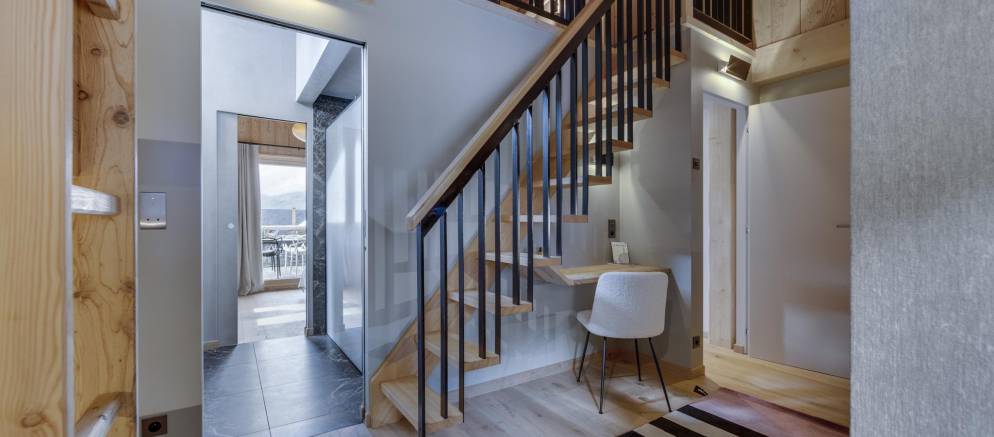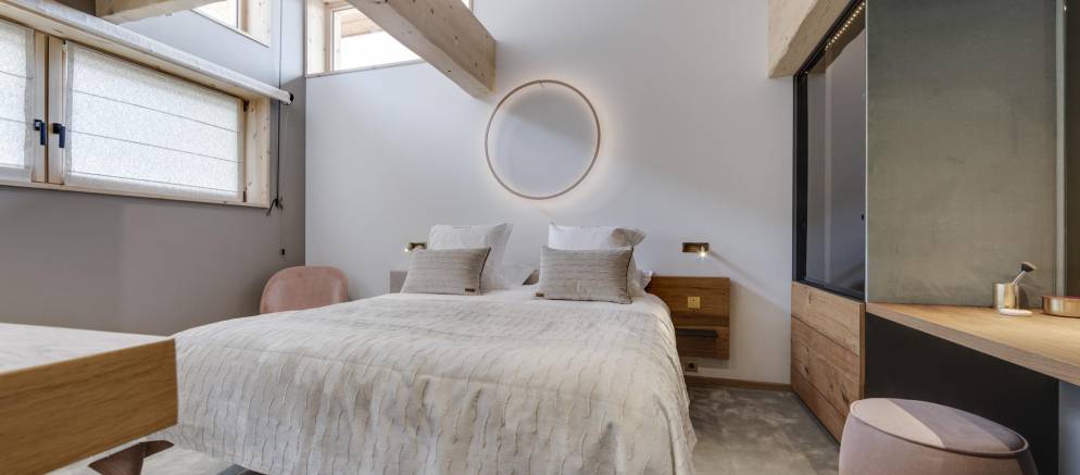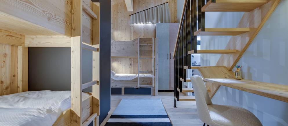 This semi-detached chalet is arranged over three floors and 200m2 of floor area. There are five bedrooms accommodating 8-12 guests. The chalet design takes inspiration from the pioneering architecture of Les Arcs, offering a calm and soothing ambiance. Lightly coloured wood and natural tones give way to fabulous panoramic views across the Tarentaise valley, which, thanks to the large windows, are also visible from inside.
