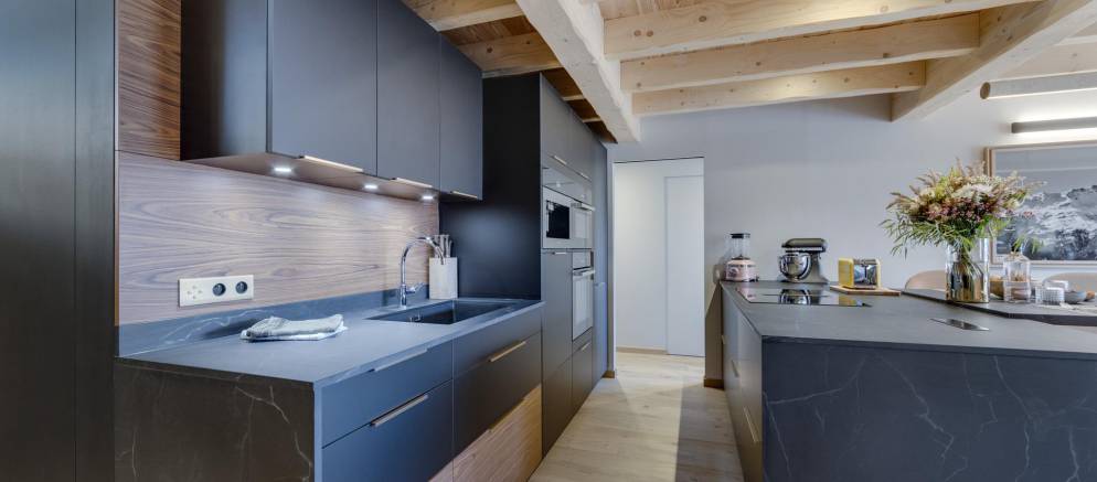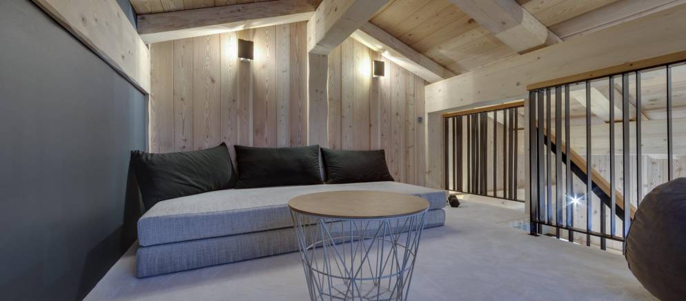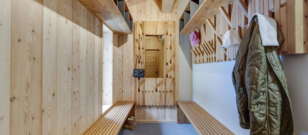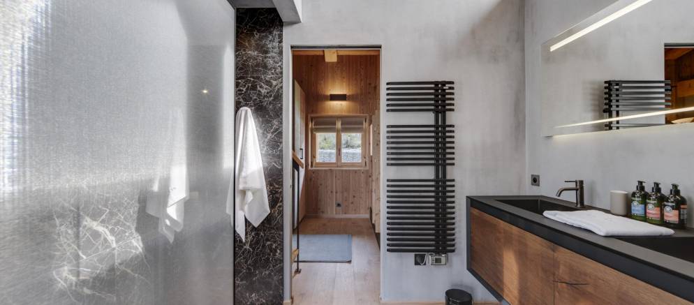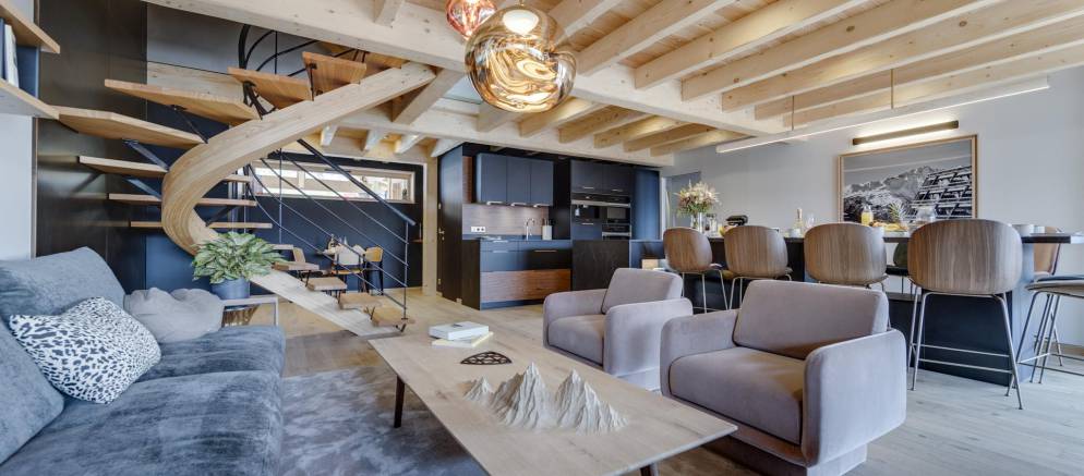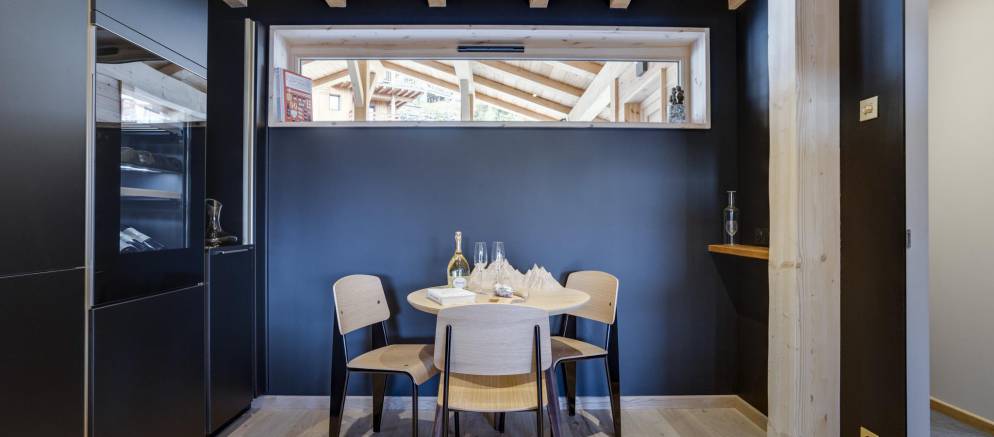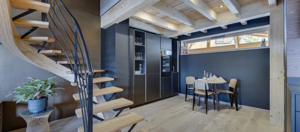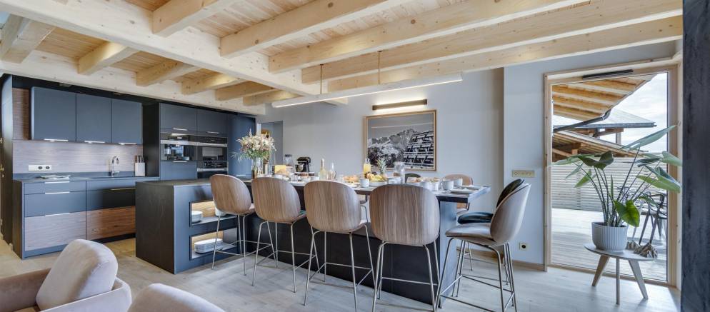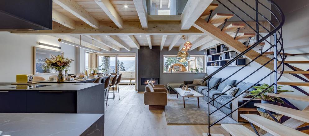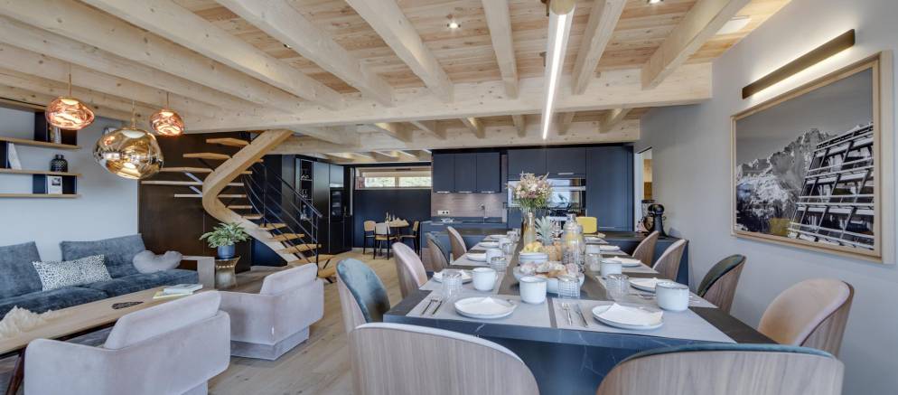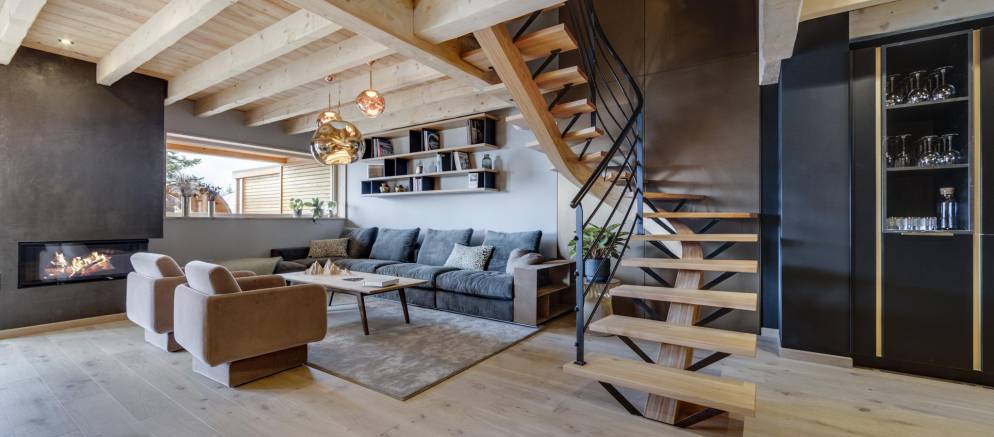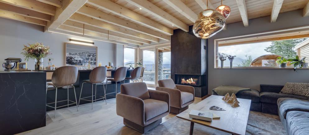 Entering the chalet on the ground floor you firstly arrive into a ski room / cloakroom where there is plenty of hooks for your mountain clothing. This room flows through to the open plan living spaces with a lounge with fireplace, kitchen with island unit and two separate and different sized dining tables. This space is very convivial and full of lovely designer touches and subtle lighting.