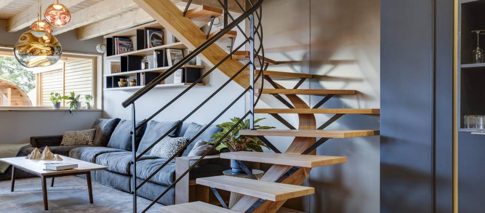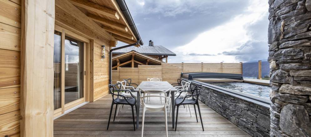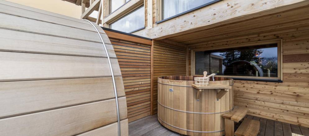 The living room opens out onto a wide terrace that invites you to unwind and refresh in an array of spa facilities. Take a dip in the swimming pool, let the warmth of the barrel sauna ease-tired muscles, before sinking into the fun of the Nordic hot tub. In the warmer spring months, the outdoor dining table invites you to dine al fresco.