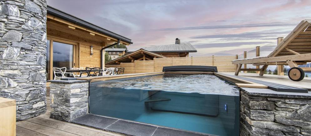 Chalet Bela Vya 2 Ski & Spa is located in the hamlet of Courbaton just below Les Arcs 1600. This striking self-catered chalet offers a peaceful setting with an exceptional mountain panorama the backdrop for your mountain holiday. From this unique setting you can unwind in the extensive outdoor spa area, with swimming pool, sauna and Nordic hot tub, whilst inside simply relax in contemporary comfort.