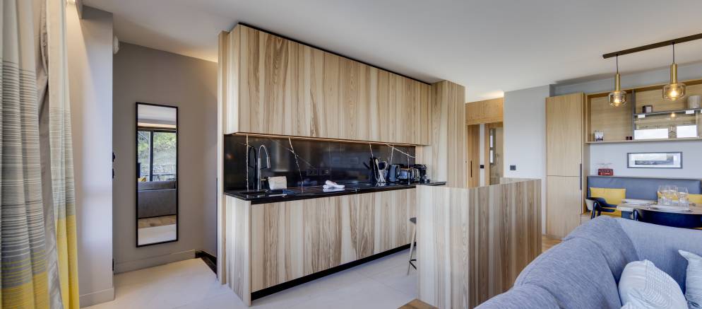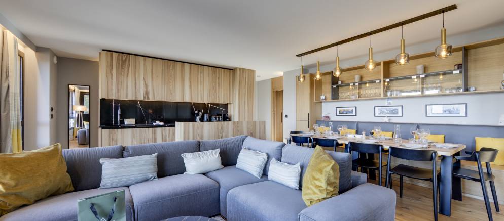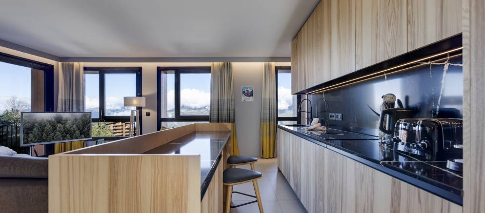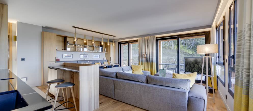 The apartment offers 112m2 of floor area and sleeps up to 8 guests in four bedrooms. On the upper floor, the open plan living area with lounge, dining table and kitchen features large windows and expansive views. The lounge is equipped with a flat screen TV for cosy nights in and opens onto a south-west facing terrace with an alpine backdrop.