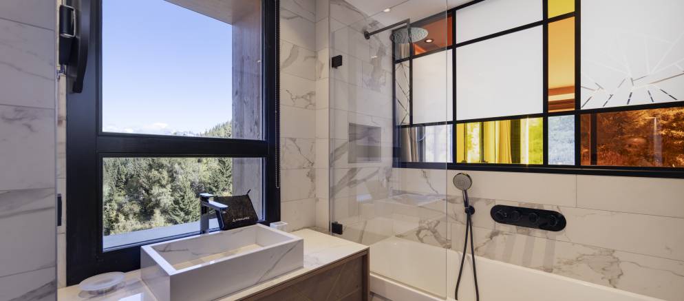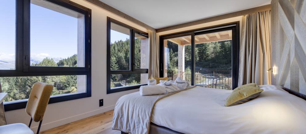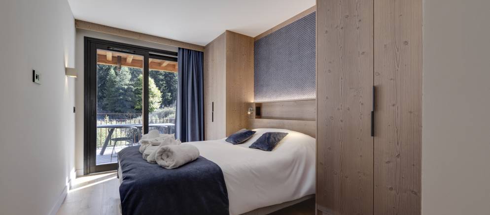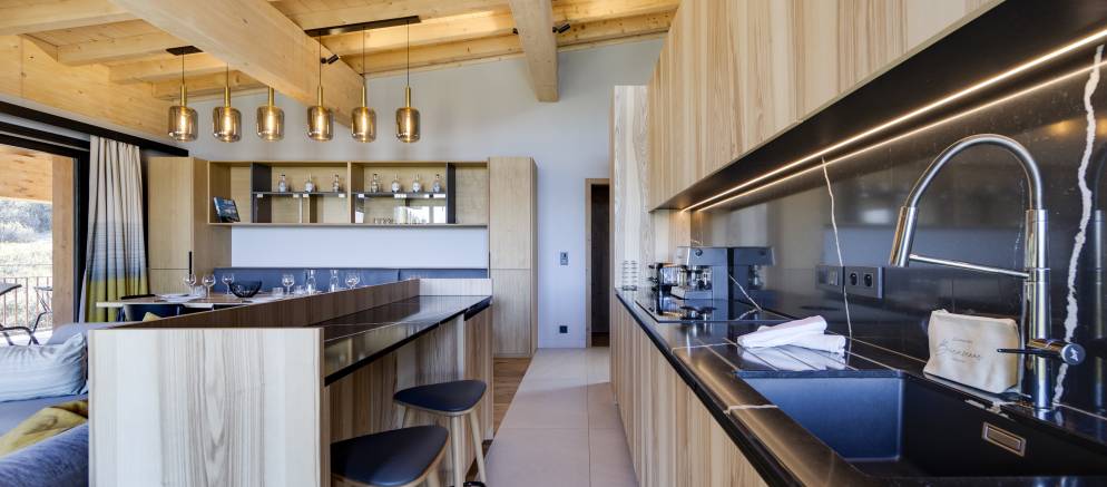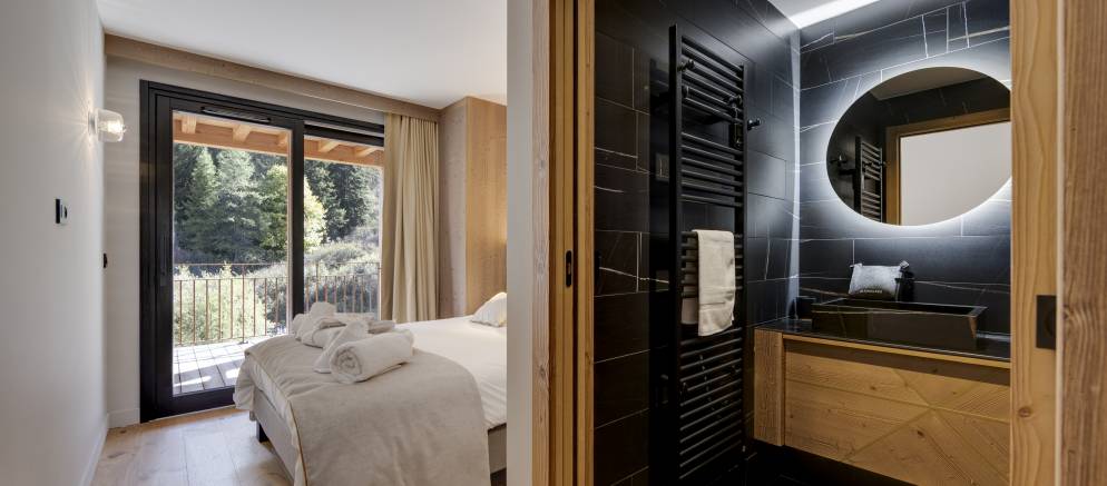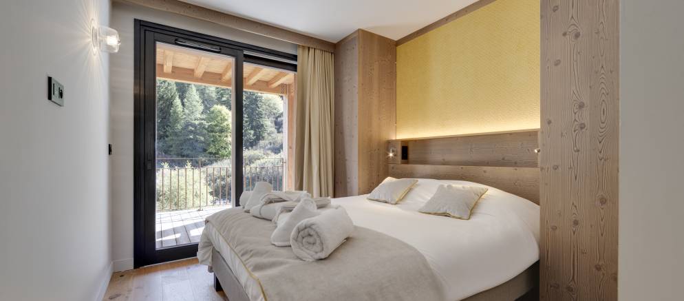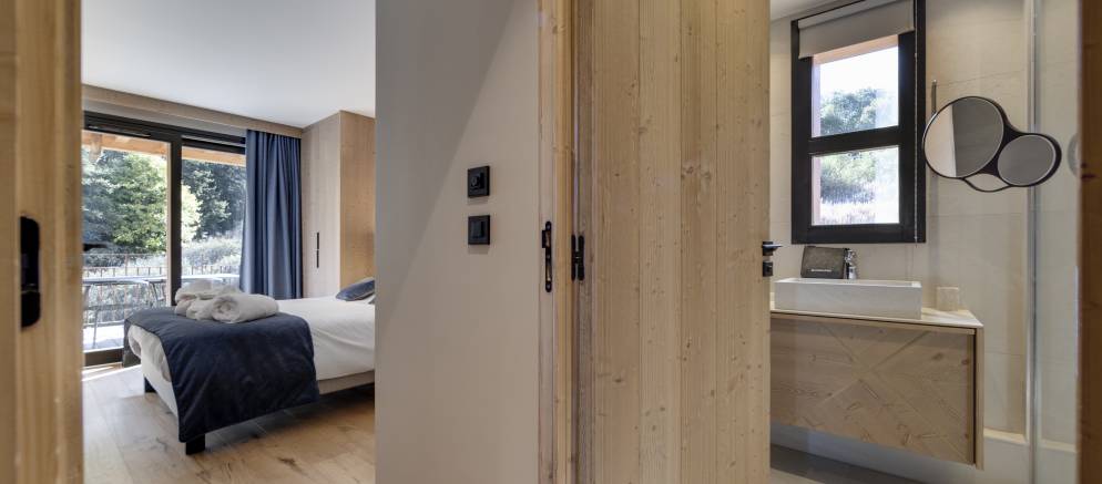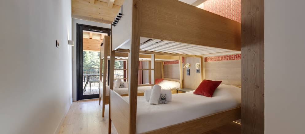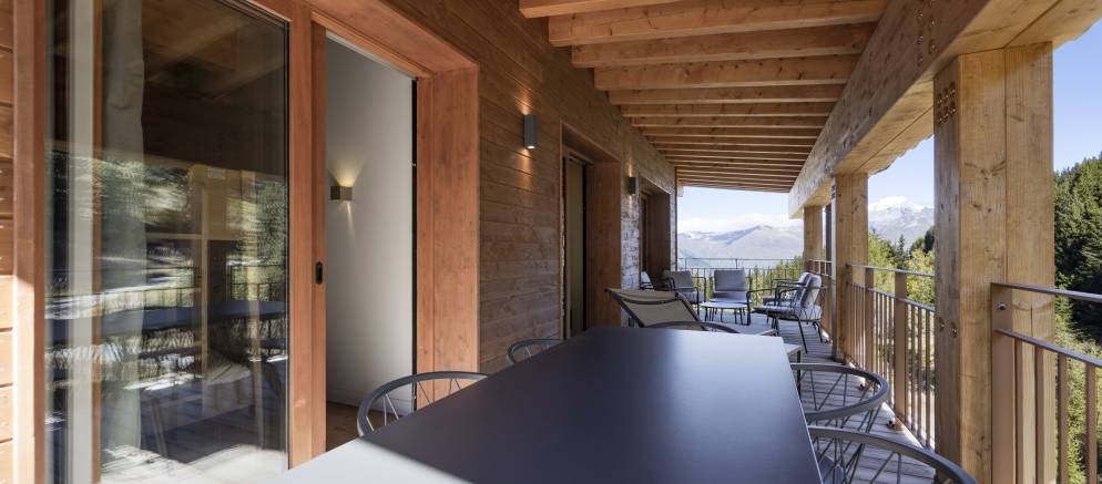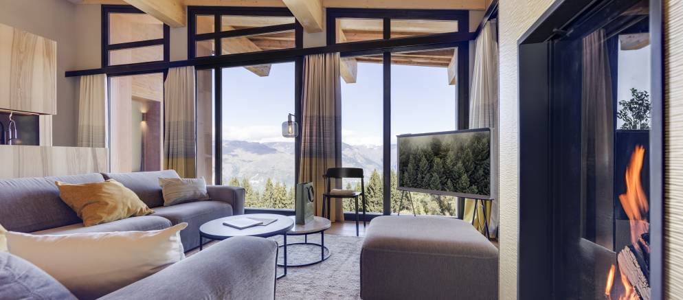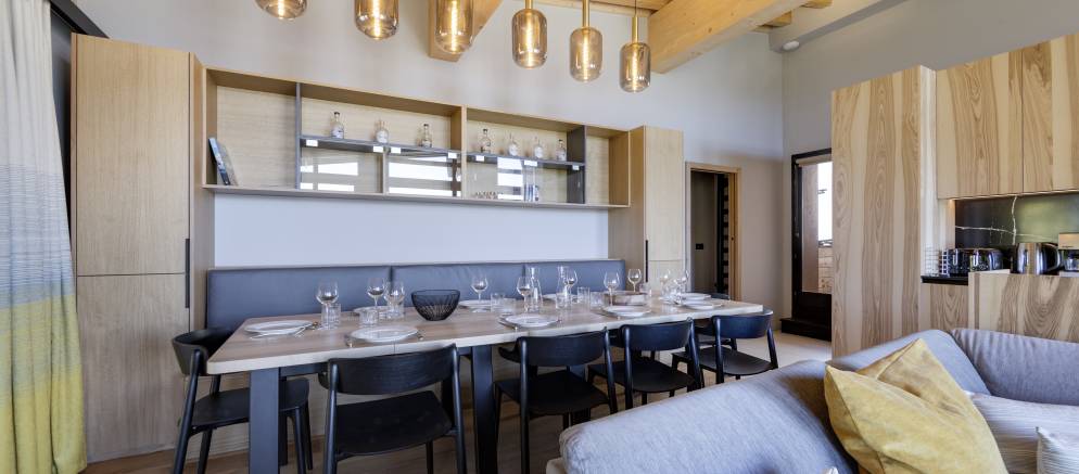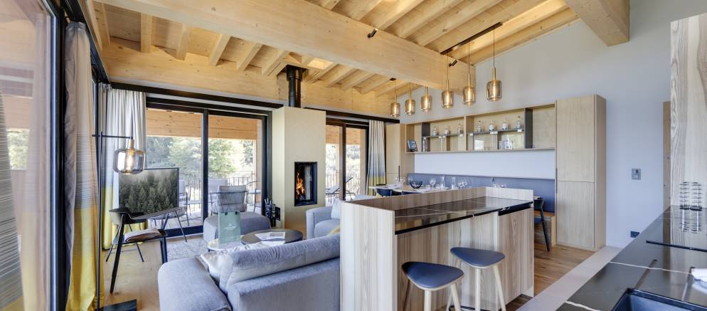 The apartment offers 126m2 of floor area and sleeps 6-10 guests in four bedrooms. On the upper floor, the open plan living area with lounge, dining table and kitchen features a high ceiling, large windows and stunning views. The lounge is equipped with a wood burner and large screen TV for cosy nights in and opens onto a large terrace with a mountain backdrop.