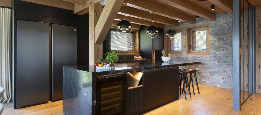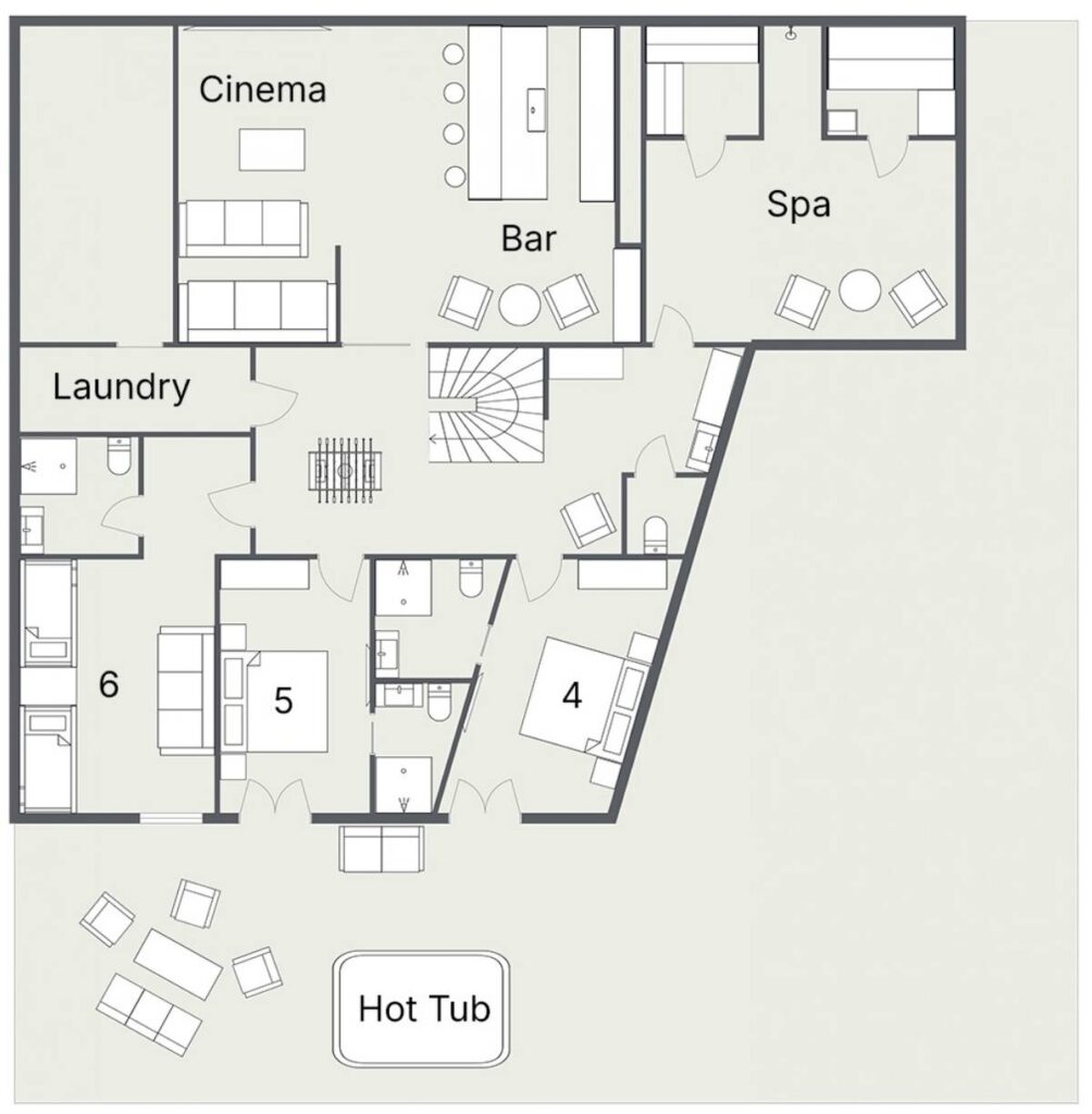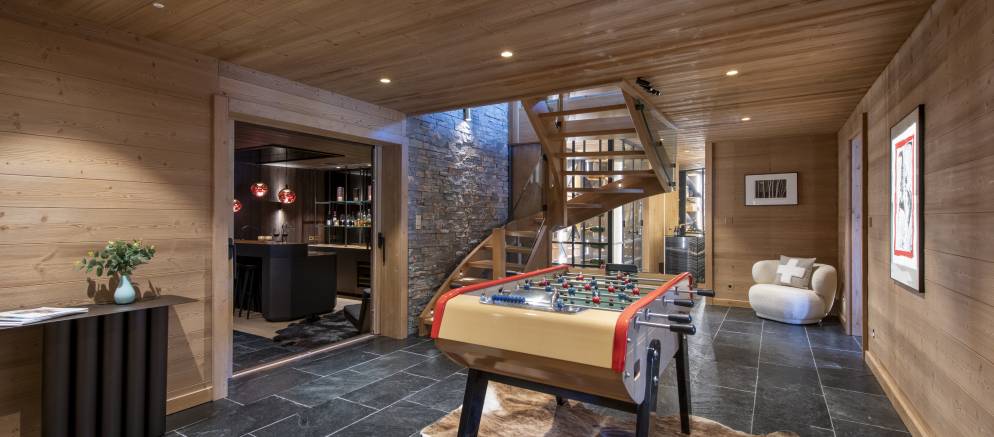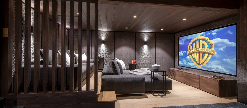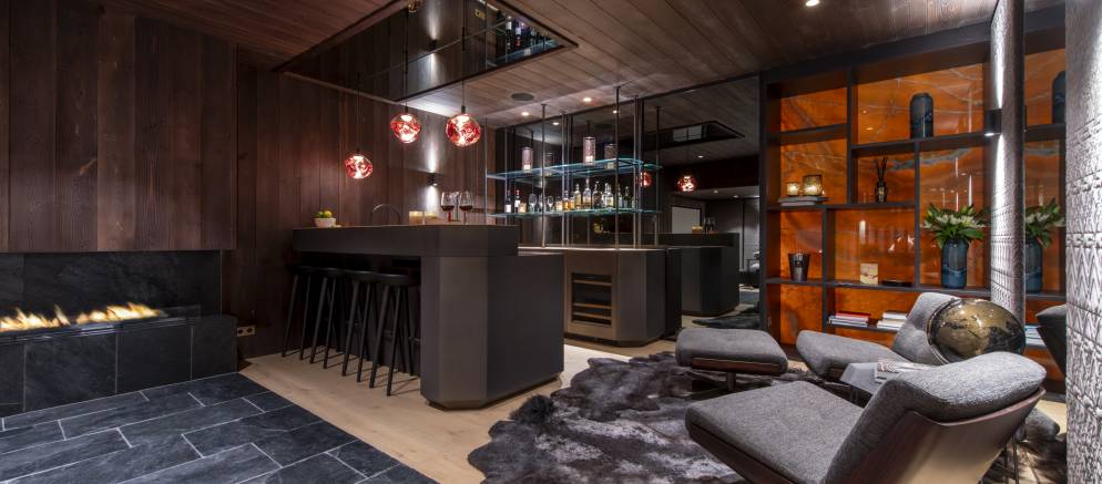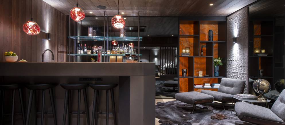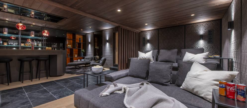 Downstairs the chalet transitions to a darker and more intimate interior style, especially in the bar and cinema, which is a truly show stopping space. The cinema features several tiers of seating, a large projector and incorporated surround sound, with the adjacent bar the perfect spot to relax and recap on your day’s adventures.