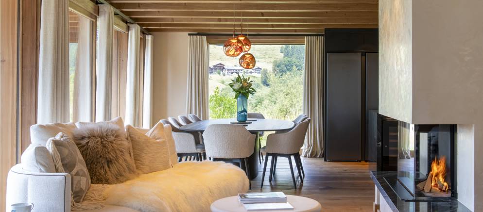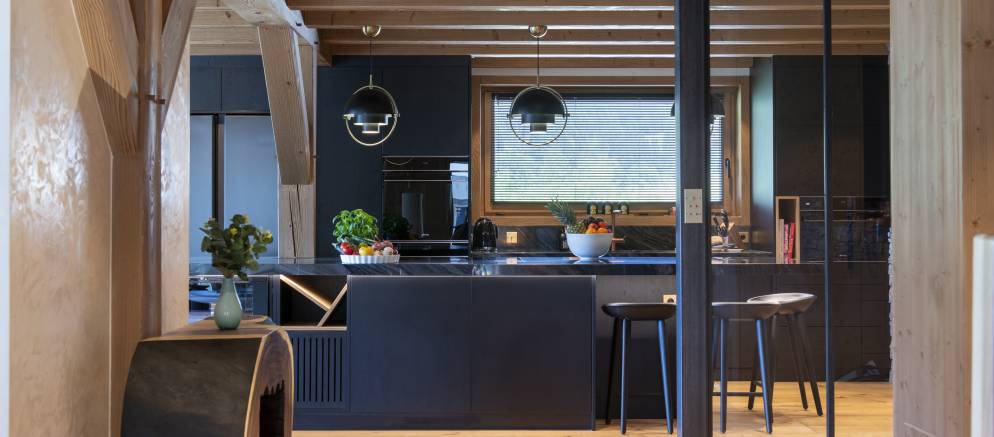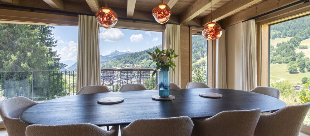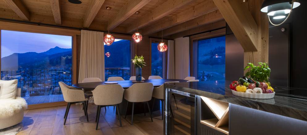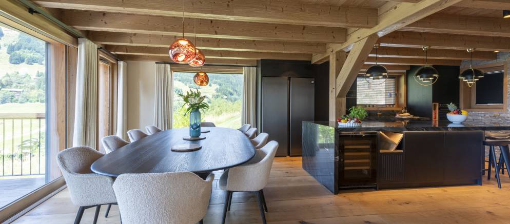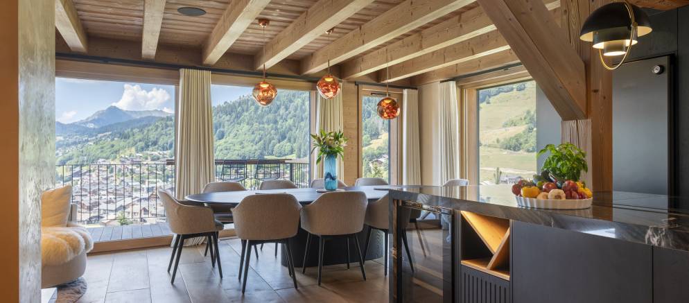 The kitchen is well appointed, and you have both indoor and outdoor dining options. Inside, enjoy evening dinner parties complemented by subtle lighting, or outside, a large custom oak table set on the balcony is easily accessible when the weather allows. Wherever you sit you’ll enjoy incredible views over Les Gets, and the ski slopes of both Chavannes and Mont Cherry. The westerly aspect is ideal for evening sunlight and Alpine sunsets.