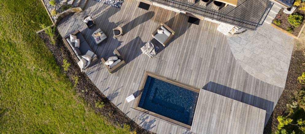 Also on the lower ground floor, the spa facilities invite you to indulge to your hearts content. A salt stone sauna and hammam, alongside a Gessi waterfall shower and separate relaxation area, offer the perfect excuse to simply unwind. The icing on the cake is the custom sunken hot tub cleverly concealed beneath a sliding section of the rear deck and positioned to take in the panoramic views.