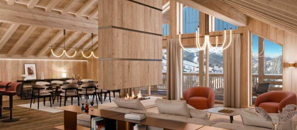 The Bois des Ours 301 apartment is located on the third and fourth floors and is a duplex apartment of 254m2. The spacious living areas are bathed in natural light and invite you to relax after a day’s skiing. The central ethanol fireplace adds charm and cosiness in the evenings, and panoramic views across the valley can be enjoyed from the large terrace.