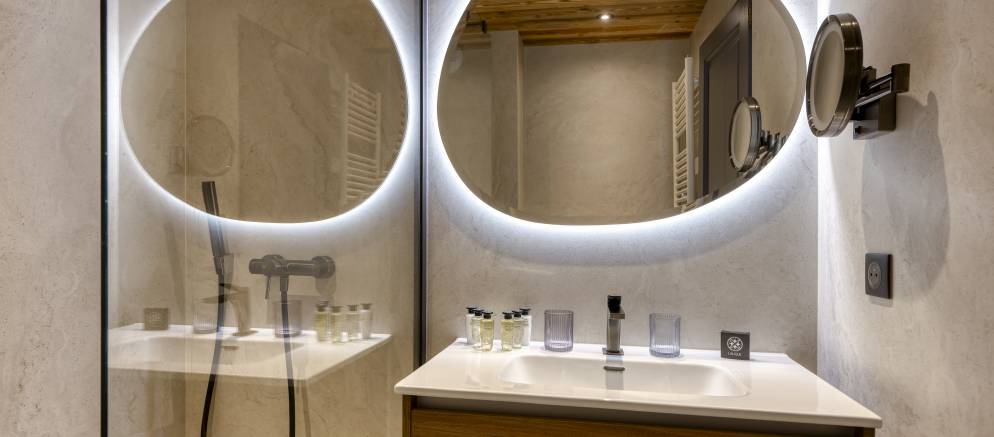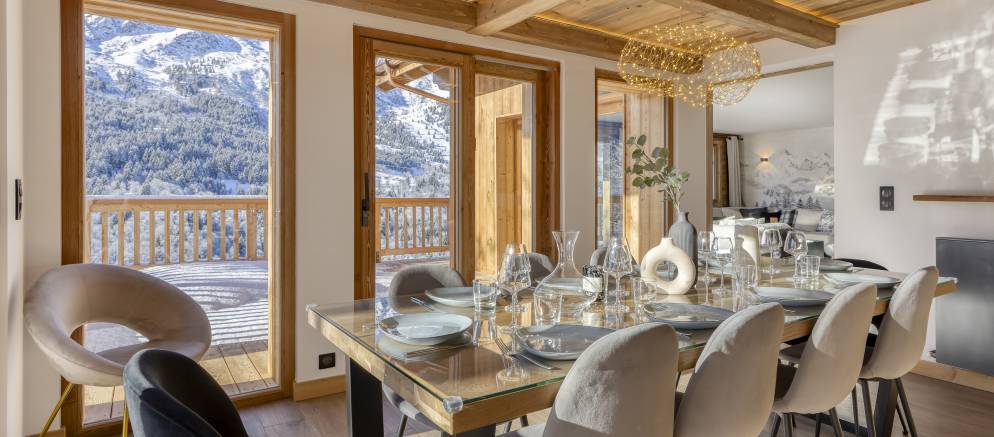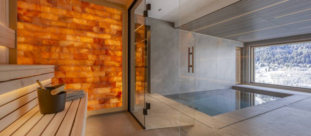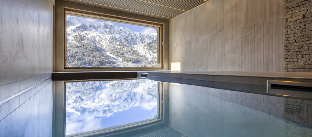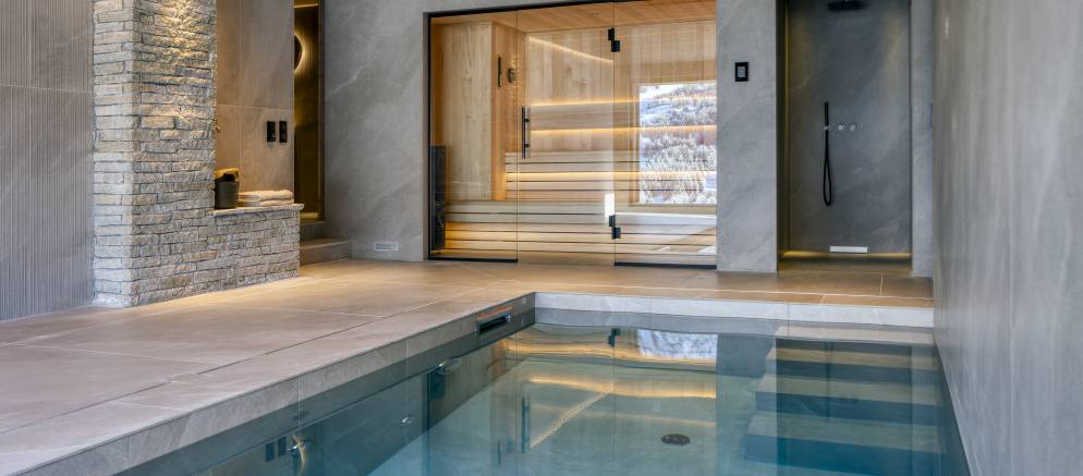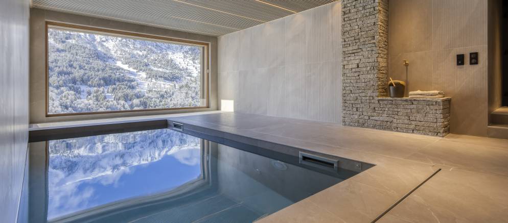 Down on the ground floor, this level is split between 3 double en-suite bedrooms and your private wellness facilities. The spa area is equipped with an indoor swimming pool with views out onto the mountains along with a sauna and steam room, all perfect for helping to unwind after a day on the ski slopes.