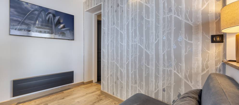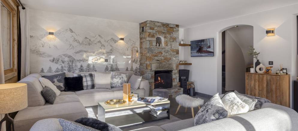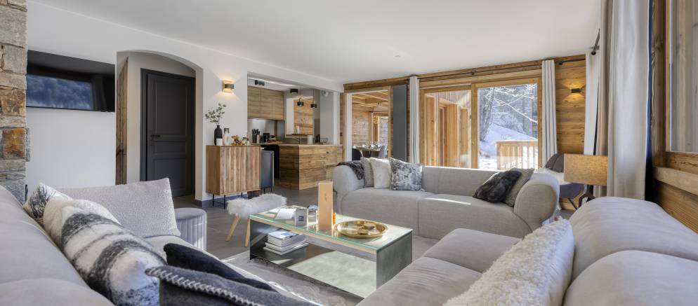Arranged across three floors and 300m2 of floor area, the chalet has a fresh and contemporary interior. The middle floor is home to the communal living spaces with a large and bright lounge with fireplace and dining room. These rooms feature large picture windows and French doors that open out onto a wide terrace. The semi-open kitchen overlooks the dining table, and there is also a separate TV room on this level.