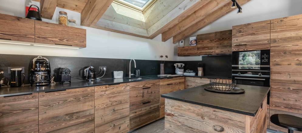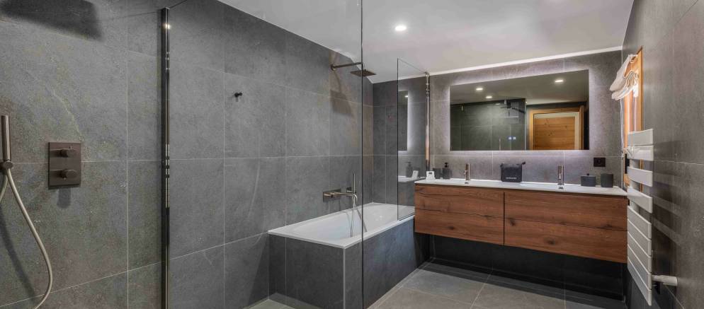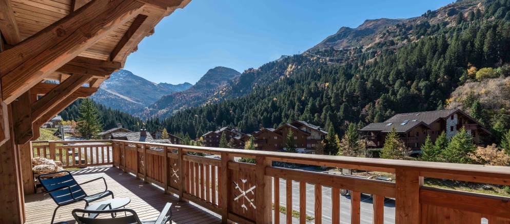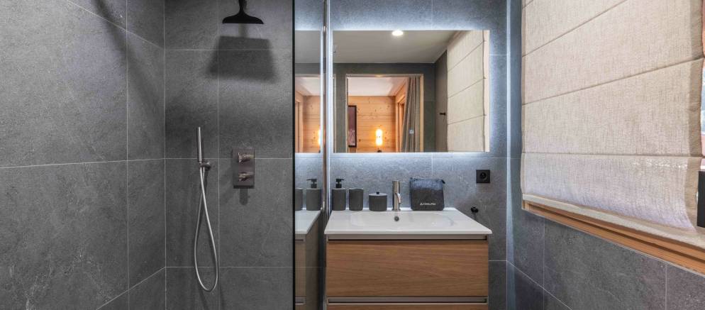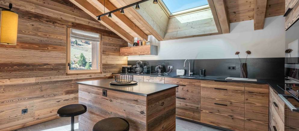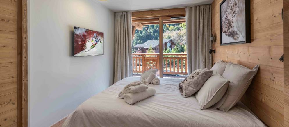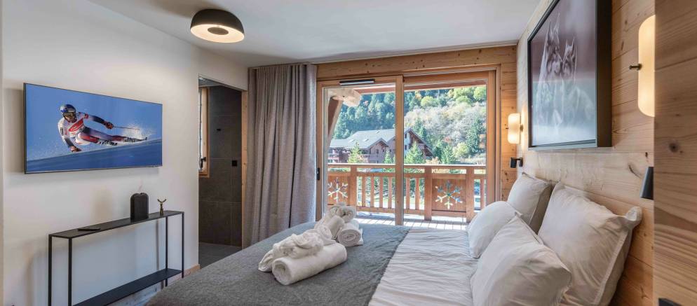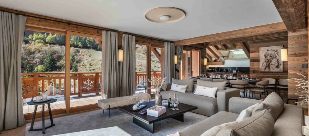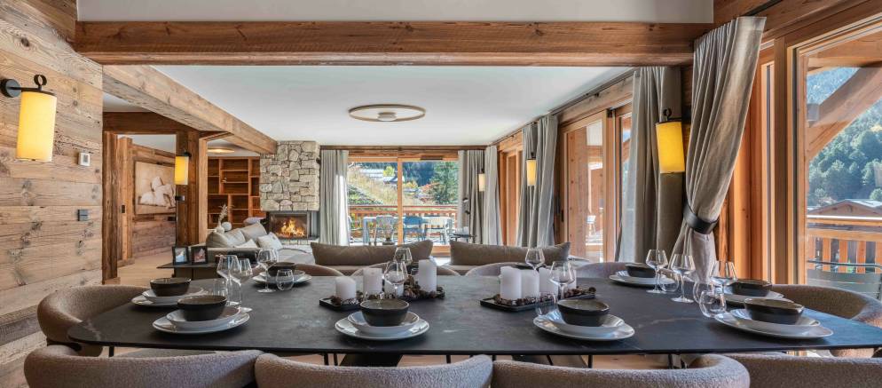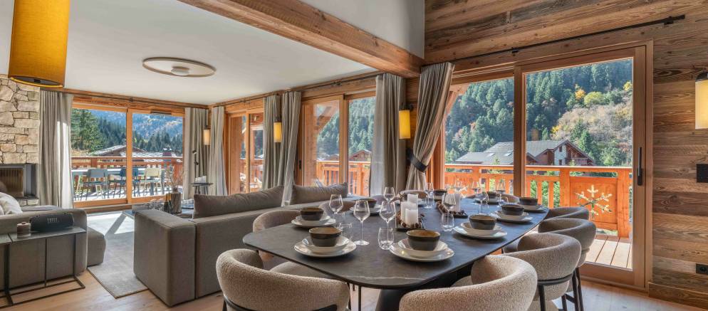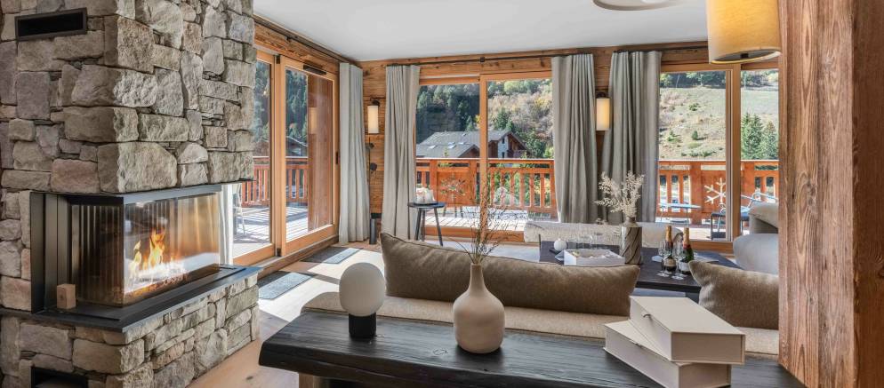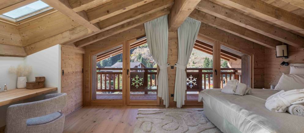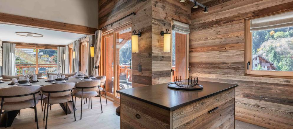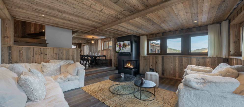 The open plan living spaces with lounge, dining and kitchen are spread across the second floor. This light filled room invites you to gather around the fireplace on the deep sofas and enjoy convivial meals together. Outside, the balcony and terrace deliver stunning panoramic views onto the mountains including south to Mont Vallon at the head of the Meribel valley.