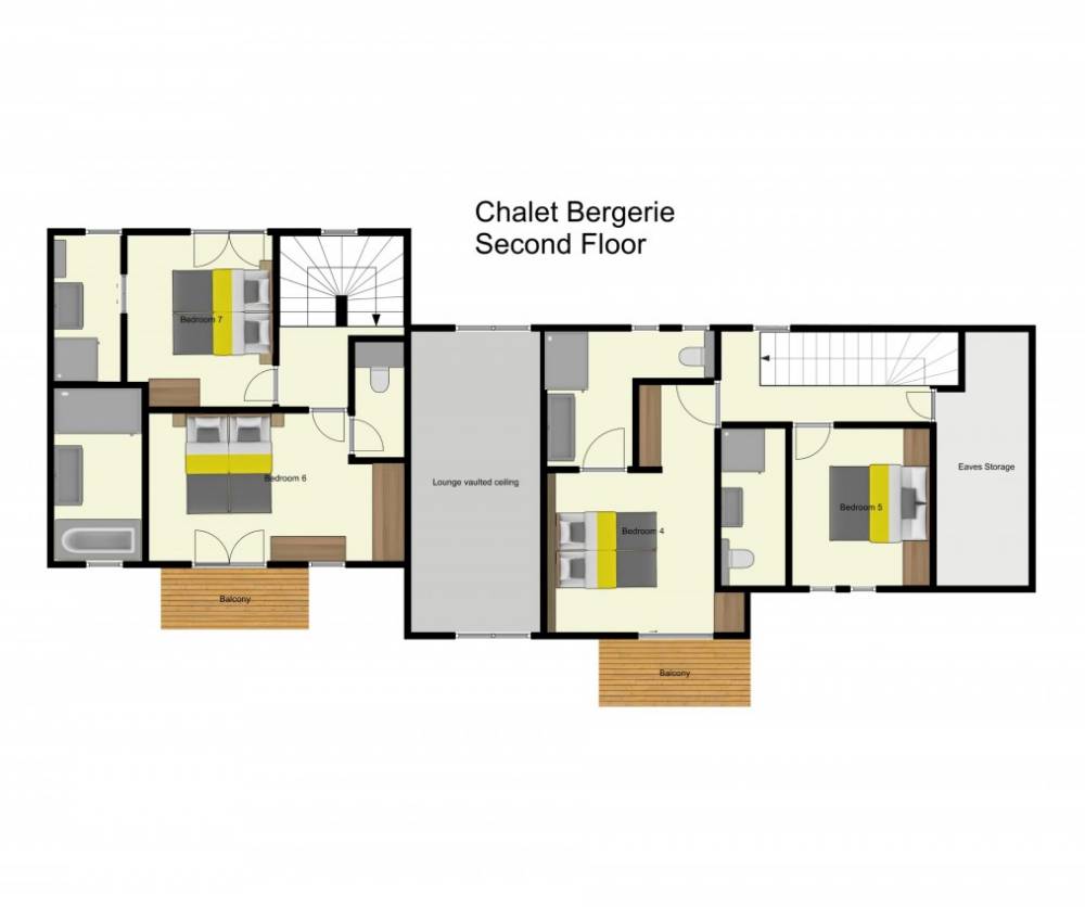 The seven en-suite bedrooms are arranged between the three floors, with two twin/double rooms on the ground floor. On the middle floor there is one twin/double and on the top floor three twin/double and one double room. Three of the rooms also feature private balconies and the dedicated ski room has boot warmers.
