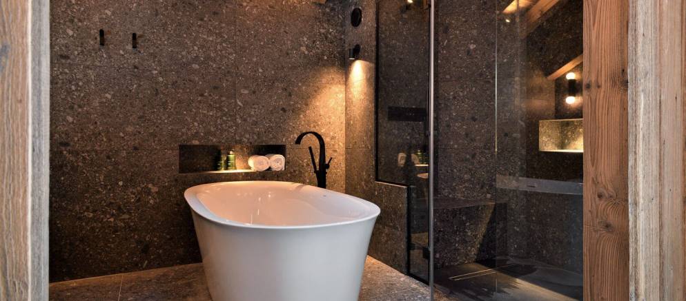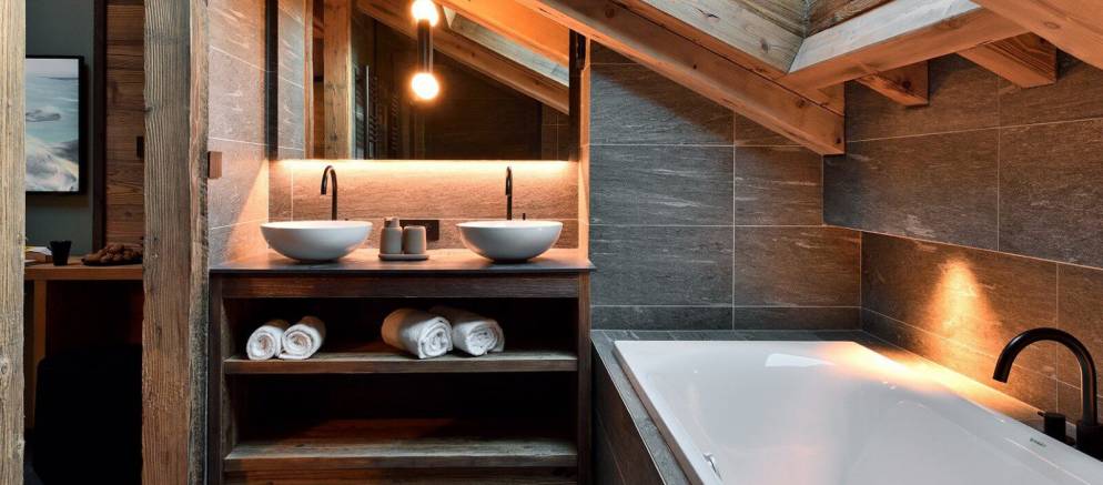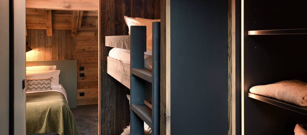 The chalet has five en-suite bedrooms split between the first and second floors, and they provide flexible rooming for different group requirements. On the middle level is the master suite with an en-suite bath and shower room along with direct access to the outdoor Nordic hot tub. There is a further double room with en-suite shower room, along with a charming children’s bunk room sleeping 5.