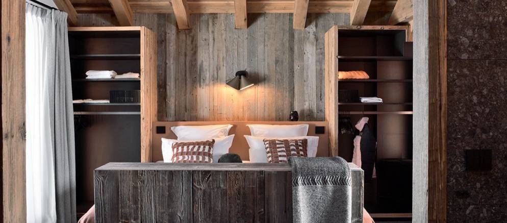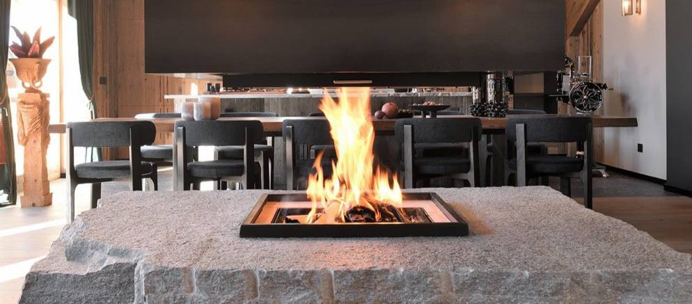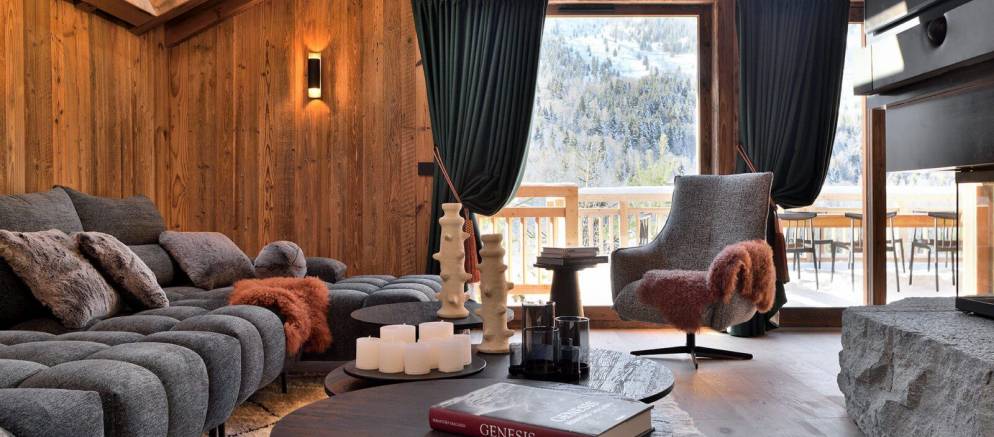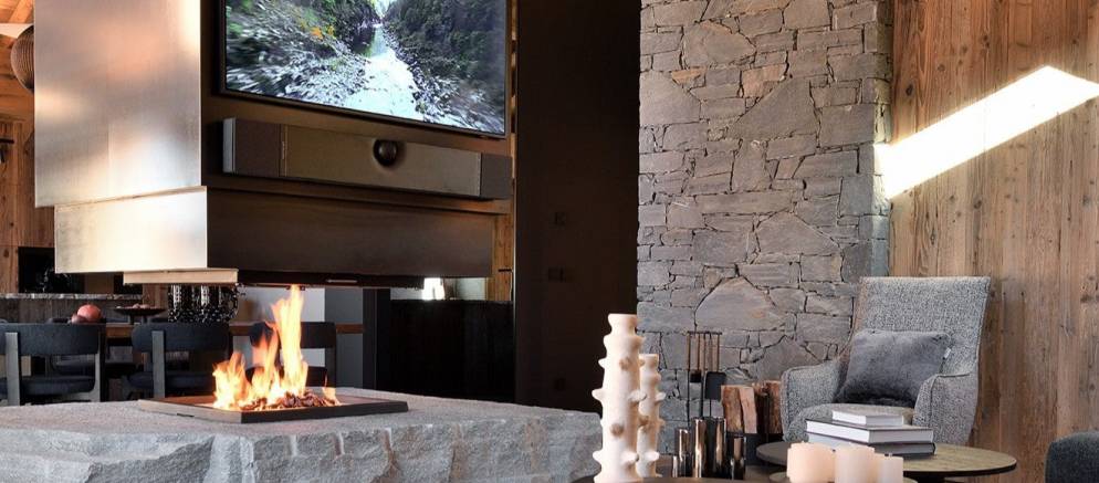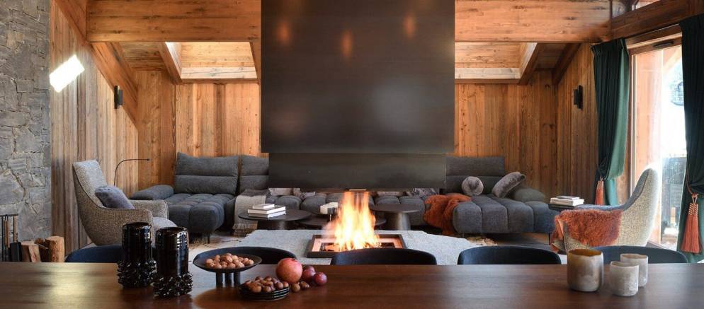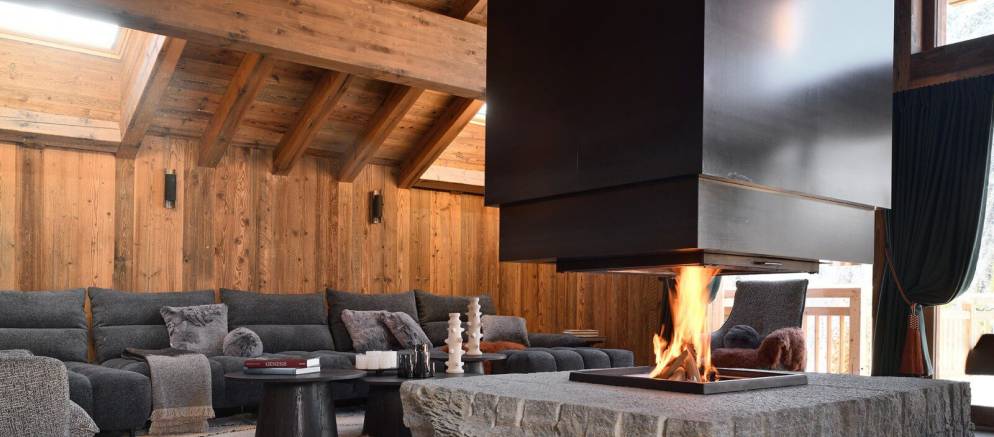 Arranged across three floors, the spacious living room on the first floor features a fireplace, deep sofas, dining area and open-plan fully equipped kitchen. Outside, the terrace is equipped with a plancha and a large table to enjoy lunch overlooking the mountains. The Nordic bath invites you to sink into its warm waters, whilst the gondola cabin in the garden will delight children’s imagination.