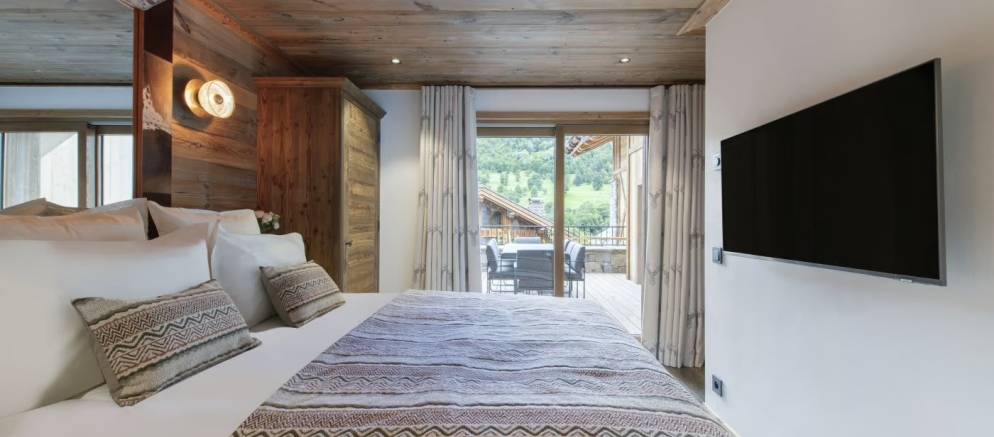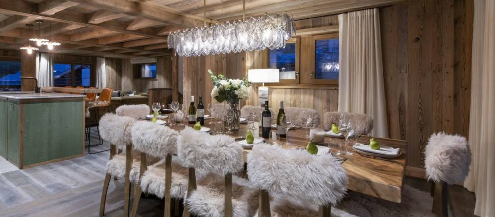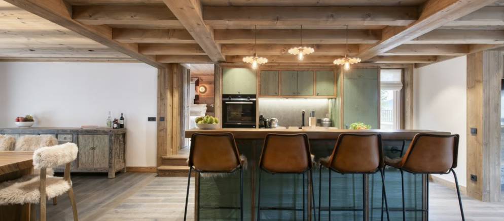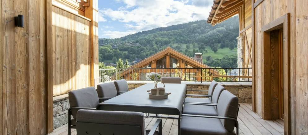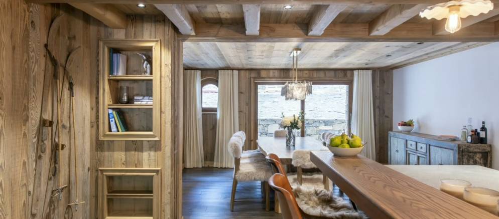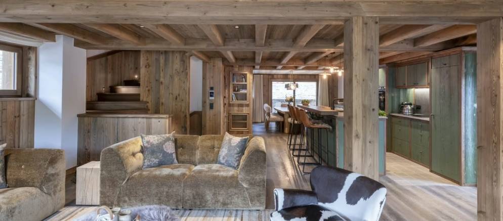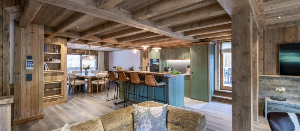 Take the stairs up to the middle floor where the open plan living spaces welcome you. This really is the heart of the chalet where the living, dining, and kitchen area combine to offer a precious space to spend time together. Natural light floods in through floor-to-ceiling windows, leading onto a balcony and large terrace with dining table, both with panoramic views of the surrounding mountains.