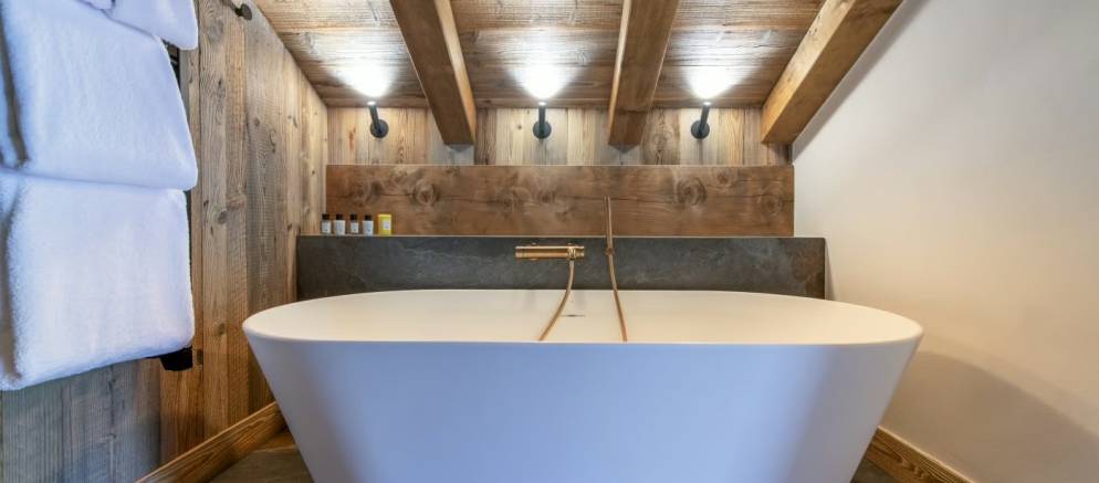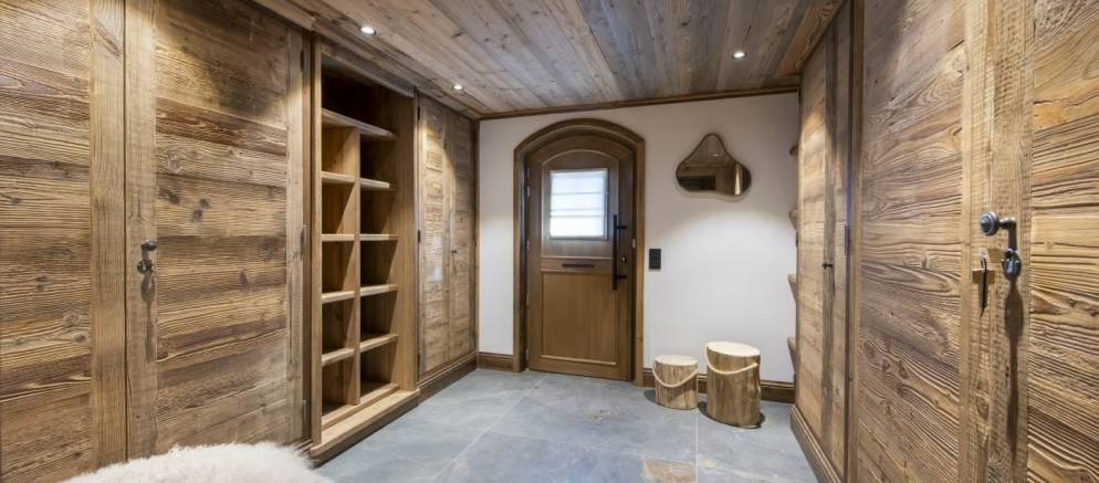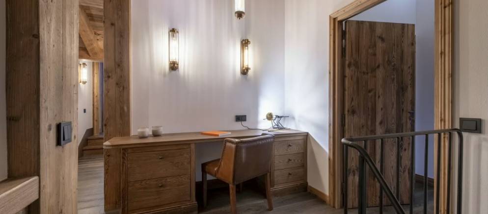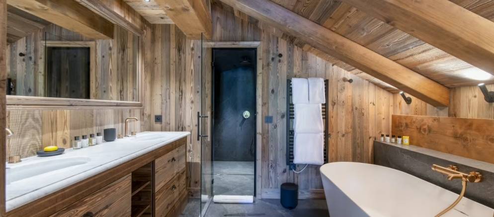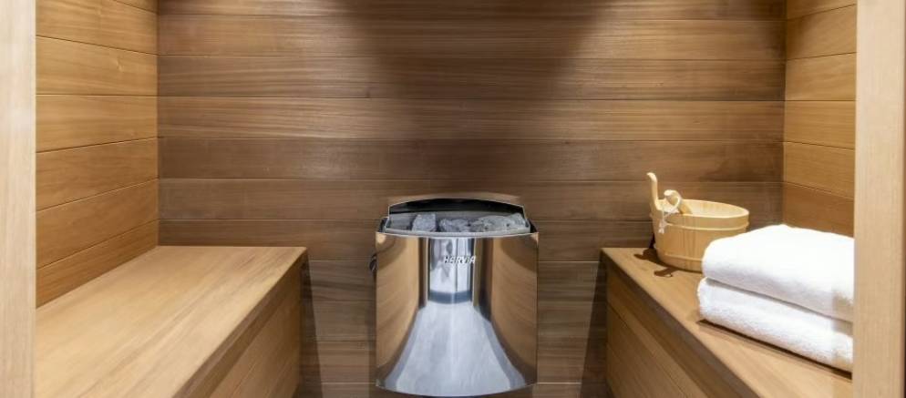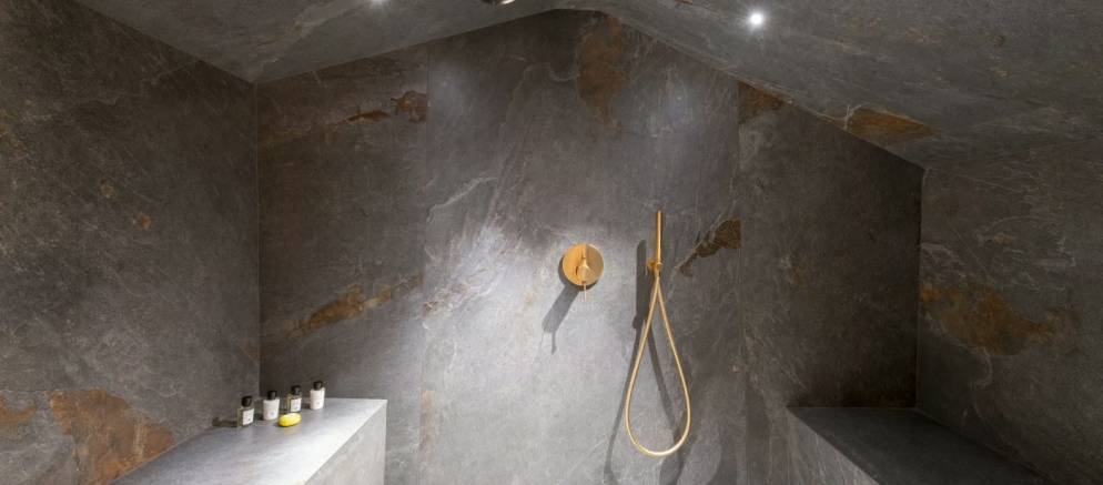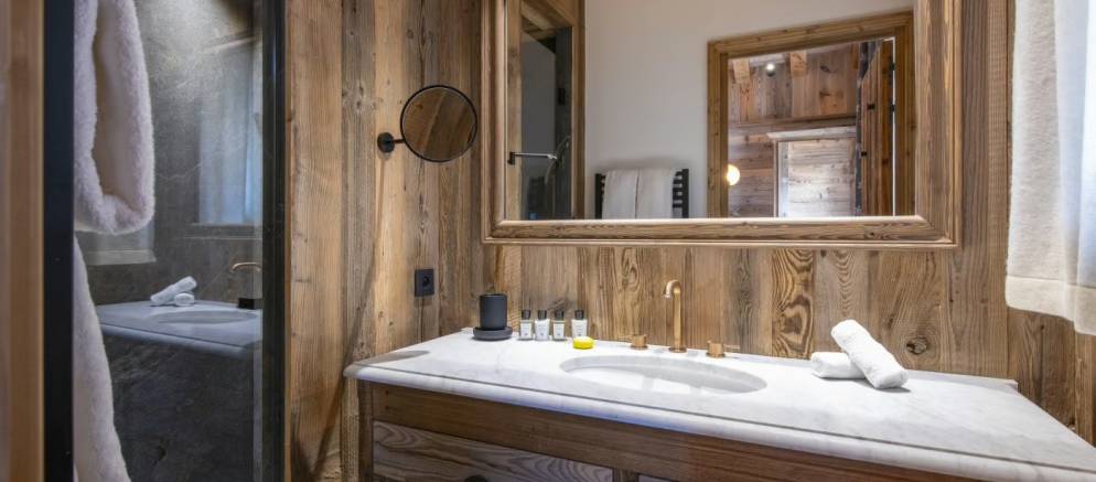 The entrance to the chalet is on the ground level where you arrive at the ski room with boot heaters and plentiful storage. This space flows through to a corridor providing access to a laundry room, to the garage where you have 2 car parking spaces, as well as the first double bedroom with a stone-tiled shower and elegant gold fixtures. There is also a sauna that offers the perfect excuse to unwind after a day on the slopes.
